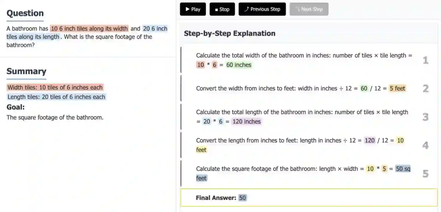 翻译:大型语言模型(LLMs)的推理能力使其在多个关键应用中得到日益广泛的使用,尤其是在教育领域,它们支持问题解决、辅导和个性化学习。众所周知,思维链(CoT)推理能力[1, 2]有助于LLMs将问题分解为步骤并更有效地探索解空间,从而在数学和推理基准测试中取得令人印象深刻的性能。随着每个问题的CoT标记长度大幅增加,甚至达到每个问题数千个标记[1],用户如何理解LLM的推理并检测错误或幻觉尚不清楚。为解决此问题并理解推理如何改善人机交互,我们提出了三种新的交互式推理界面:交互式思维链(iCoT)、交互式程序思维(iPoT)和交互式图(iGraph)。具体而言,我们要求LLMs自身生成一个围绕原始CoT内容包装的交互式Web界面,该界面可以以文本(iCoT)、图(iGraph)或代码(iPoT)形式呈现。此界面允许用户交互式地阅读和验证LLMs的推理链,提供新颖的体验。在一项涉及125名参与者的研究中,交互式界面显著提高了用户性能。具体而言,iGraph用户的错误检测率最高(85.6%),其次是iPoT(82.5%)和iCoT(80.6%),均优于标准CoT(73.5%)。交互式界面还缩短了用户验证时间——iGraph用户(每个问题57.9秒)比iCoT和iPoT用户(60秒)以及标准CoT用户(64.7秒)更快。一项研究后问卷调查显示,用户更偏好iGraph,认为其能更有效地帮助他们跟踪LLM的推理过程。我们讨论了这些结果的意义,并为未来推理模型的设计提供了建议。