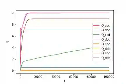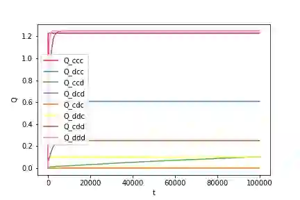 翻译:我们调查了屡次囚犯的两难游戏,即双方选手轮流使用强化学习来获得最佳的记忆一体战略。 我们理论上解决了同时同时出现的加强学习的贝尔曼最佳方程式。 我们发现,Win-stay Loste-轮班战略、格林战略以及总是有缺陷的战略可以形成所有确定性记忆一型战略之间相互强化学习过程的对称平衡。