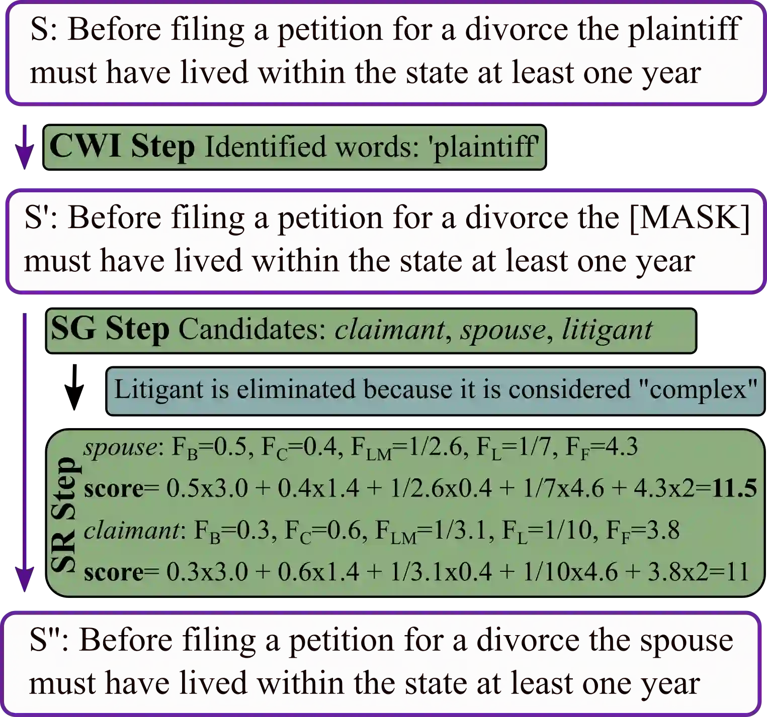 翻译:法律文本的处理是自然语言处理(NLP)的一个新兴领域。法律文本在词汇、语义、语法和形态学中包含独特的术语和复杂的语言特征。因此,制定法律领域特有的文本简化方法对于便利普通人理解法律文本和为主流法律文本应用的高层次模式提供投入至关重要。最近的一项研究为法律文本提出了一个基于规则的TS方法,而法律领域的基于学习的TS在法律领域却从未被考虑过。我们在这里对法律文本采用了一种不受监督的简化方法(USLT)。美国LT通过替换复杂的单词和分解长句来进行具体领域的TS。为此,美国LT在句中发现复杂的单词,通过蒙面的变换模式产生候选人,并选择一个按等级分替换的候选人。之后,美国LT在保留语义含义的同时,将长句从一个较短的核心和上引出。我们证明,美国LTT在保持S-S的简单性时,将S-main-marital 方法置于州-sistrictral-stal-stal-simpal-tal-trmals。