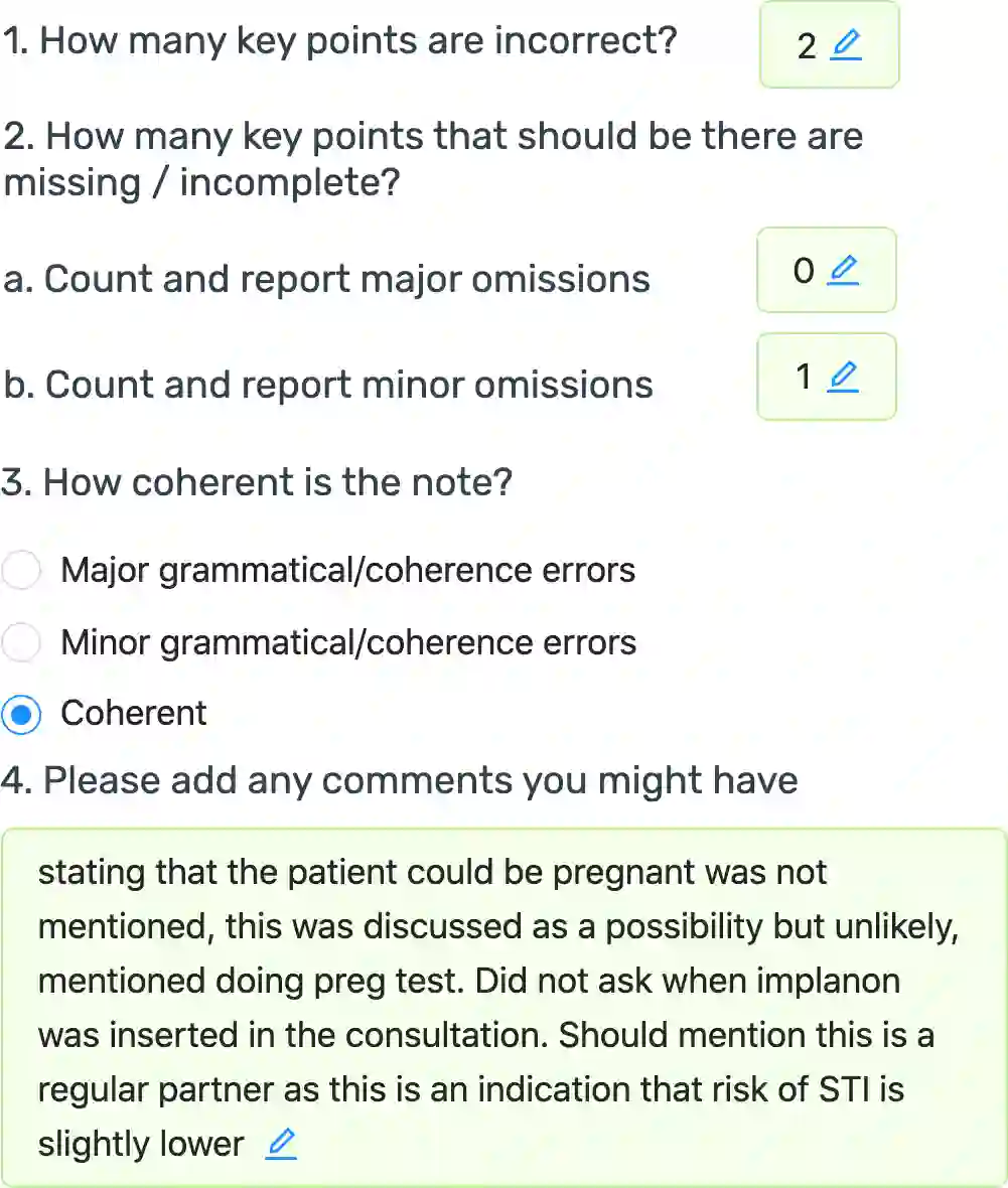 Automatic summarisation has the potential to aid physicians in streamlining clerical tasks such as note taking. But it is notoriously difficult to evaluate these systems and demonstrate that they are safe to be used in a clinical setting. To circumvent this issue, we propose a semi-automatic approach whereby physicians post-edit generated notes before submitting them. We conduct a preliminary study on the time saving of automatically generated consultation notes with post-editing. Our evaluators are asked to listen to mock consultations and to post-edit three generated notes. We time this and find that it is faster than writing the note from scratch. We present insights and lessons learnt from this experiment.