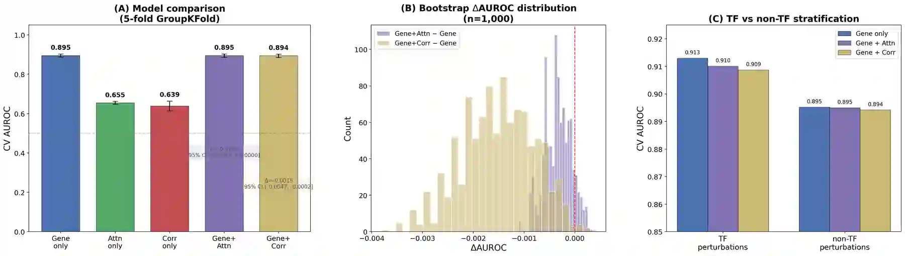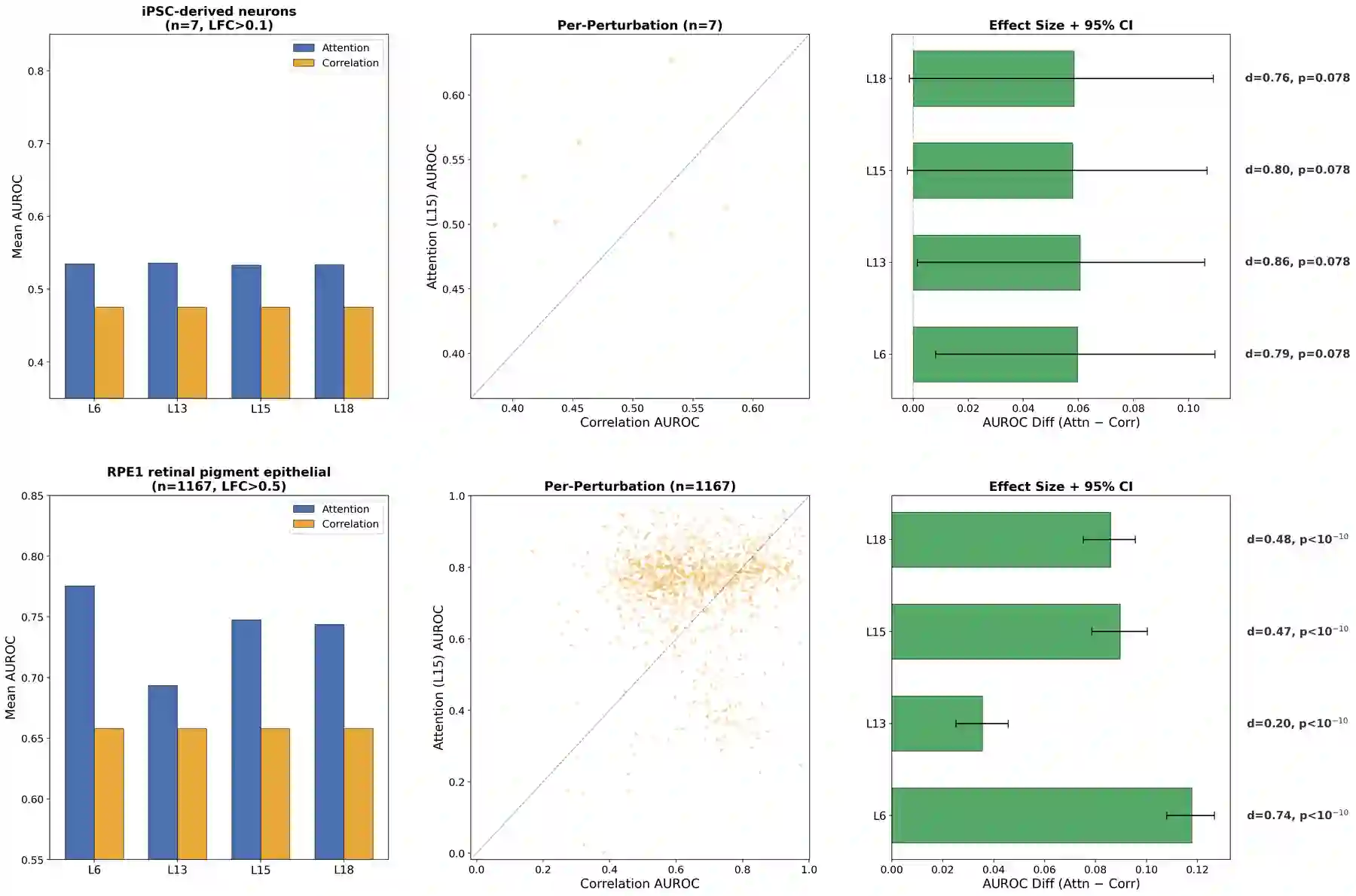 翻译:我们提出了一个系统性评估框架——包含37项分析、153项统计检验、四种细胞类型、两种扰动模式——用于评估单细胞基础模型的机制可解释性。将该框架应用于scGPT和Geneformer,我们发现注意力模式编码了具有层级特异性组织的结构化生物学信息:早期层捕获蛋白质-蛋白质相互作用,晚期层捕获转录调控,但这种结构并未为扰动预测提供增量价值:简单的基因水平基线模型在性能上超越注意力机制与相关性边(AUROC 0.81-0.88对比0.70),成对边评分未增加任何预测贡献,且调控头部的因果消融未导致性能下降。这些发现在从K562细胞到RPE1细胞中具有普适性;注意力-相关性关系具有情境依赖性,但基因水平的主导地位是普遍存在的。细胞状态分层可解释性(CSSI)方法解决了注意力机制特有的尺度失效问题,将基因调控网络重建性能提升达1.85倍。该框架为该领域建立了可复用的质量控制标准。