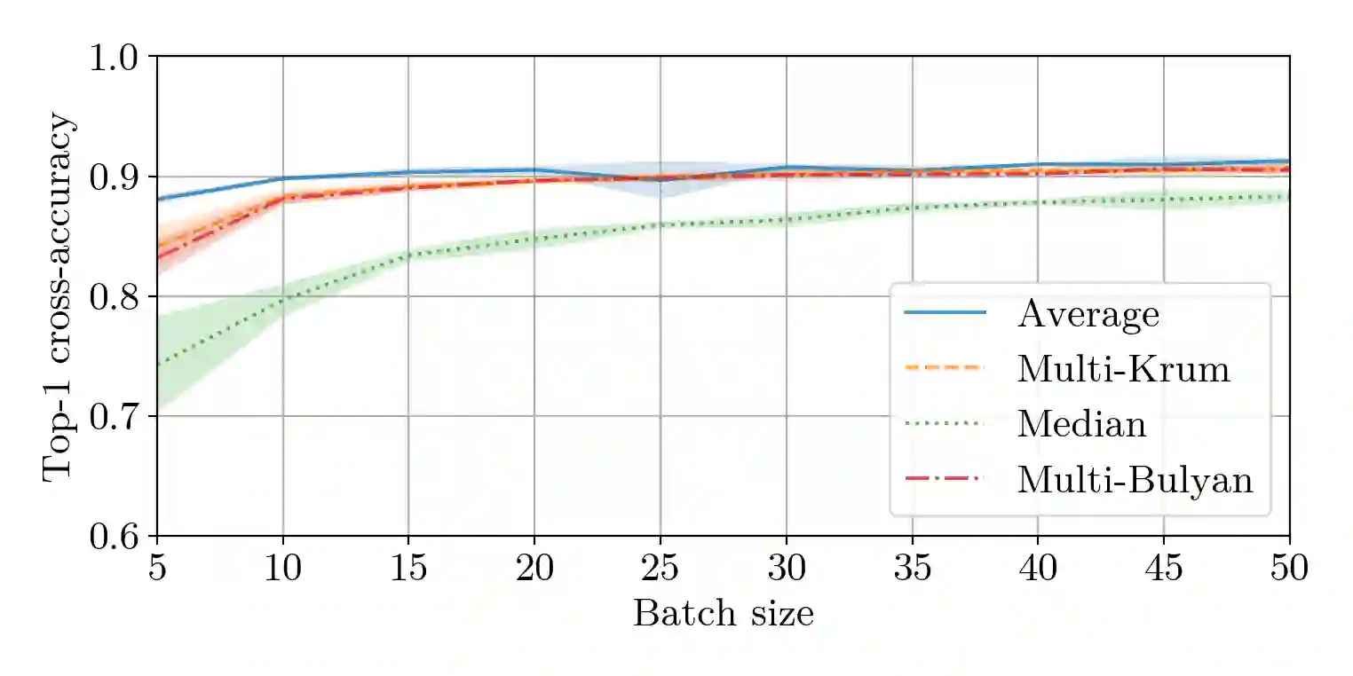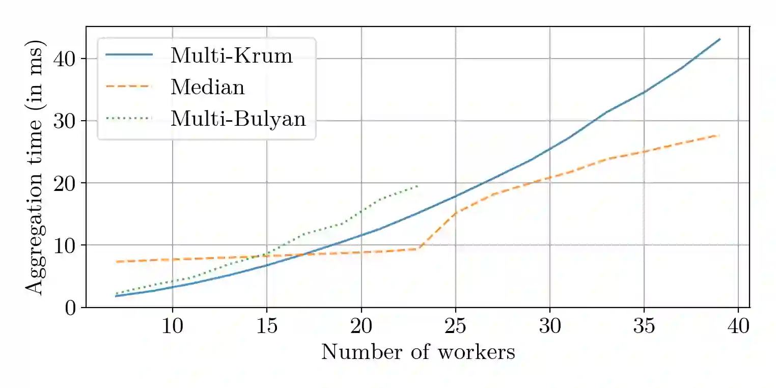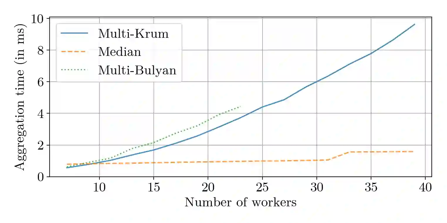 翻译:分布式机器学习的梯度汇总规则( GAR) 能否既有力又快速? 本文通过多布林语的肯定回答是肯定的。 鉴于美元工人,其中美元是任意恶意( Byzantine) 和 美元=n- f$不是,我们证明多布林可以确保强大的Byzantine抗御能力形式,以及美元(frac{m ⁇ n ⁇ $)的减速,与平均相比,这是分布式机器学习最快(但非Byzantine有弹性)的规则。当美元(几乎所有工人都是正确的)时,多布林语达到平均速度。 我们还证明,多布林语在当地计算中的成本是$(d) (类似于平均) 美元,这是多布林语中的一个重要特征,因为美元通常达到 10 ⁇ 9美元,而稳健的替代品至少以美元计算成四分价成本。 我们的理论结论得到了实验性评估的补充,除了支持线性美元(d) 复杂性论证外,还表明多布林的平行性能进一步增加其平行性。