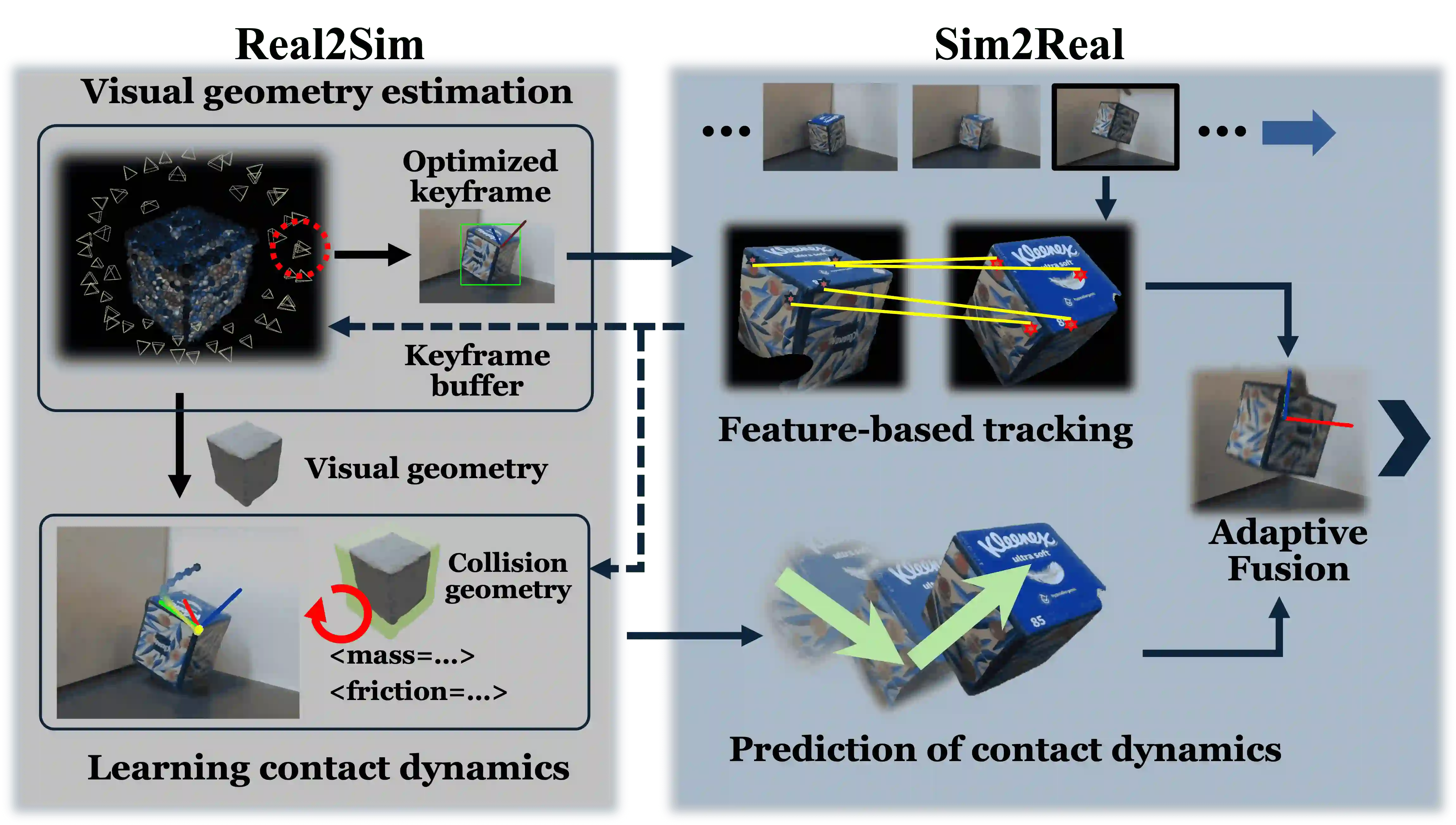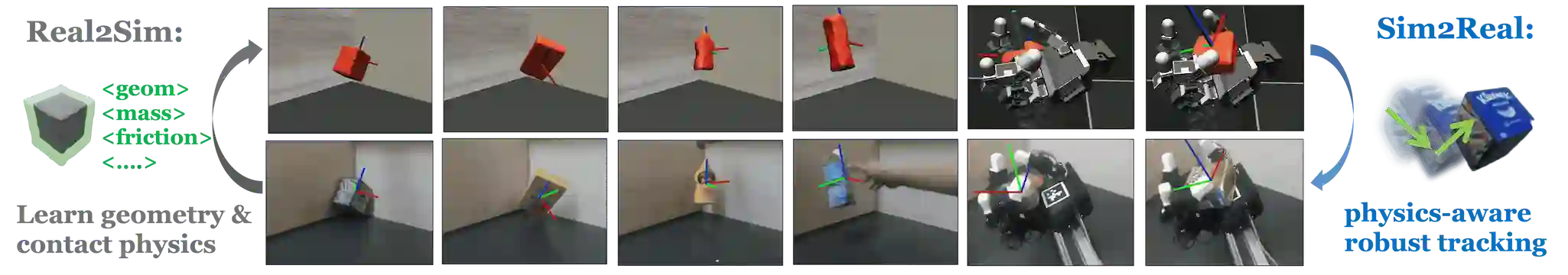 翻译:在接触丰富的场景(如灵巧手内操作)中,对先前未见、高度动态的物体进行实时追踪,仍然是一个重大挑战。纯基于视觉的方法在频繁接触交互导致的严重遮挡以及突发冲击引起的运动模糊下常常失效。我们提出了TwinTrack,一种物理感知的感知系统,通过利用接触物理线索,实现对接触丰富场景中未知动态物体的鲁棒、实时六自由度姿态追踪。其核心在于整合了Real2Sim与Sim2Real。Real2Sim结合视觉与接触物理来联合估计物体几何与物理属性:首先从视觉获得初始重建,然后通过学习几何残差并基于接触动力学一致性同时估计物理参数(如质量、惯性和摩擦)来对其进行细化。Sim2Real通过自适应融合视觉跟踪器与更新后接触动力学的预测,实现鲁棒的姿态估计。TwinTrack在GPU加速、定制的MJX引擎上实现,以保证实时性能。我们在两种接触丰富的场景上评估了我们的方法:物体坠落伴随环境接触和多指手内操作。结果表明,与基线方法相比,TwinTrack在这些具有挑战性的场景中提供了显著更鲁棒、更准确且实时的追踪,追踪速度超过20 Hz。项目页面:https://irislab.tech/TwinTrack-webpage/