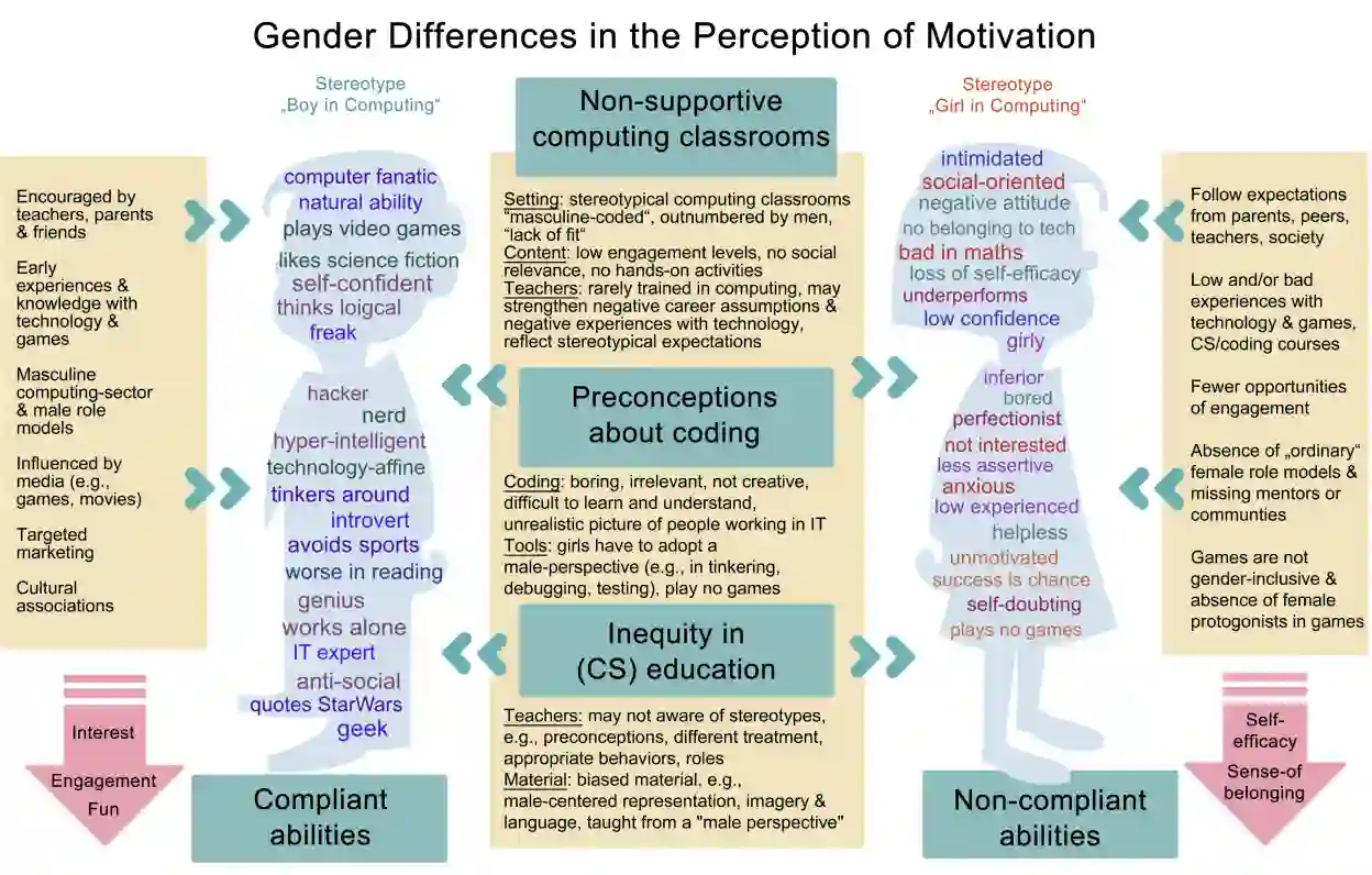 翻译:虽然女学生参与编码课程,但只有一小部分女学生计划选择职业道路时以计算机科学为主,选择职业道路时选择计算机科学(CS),在兴趣、归属感、自我效能和参与CS方面存在性别差异,这篇文章概述了CS的性别陈规定型观念,总结了CS班中12至15岁女生的负面印象,以及可能妨碍女孩对CS感兴趣的影响。本研究报告借鉴了对自2006年以来出版的28篇同行评审文章的系统审查,审查结论指出存在“计算机科学中的女孩”这种无助、无兴趣和不愉快的陈规定型形象,在早期就已经存在。 与CS的怪异性、书呆呆男同行相比,这一结构可能更加令人不安,因为它的根源是女性在CS课程中缺乏技术,不适应CS职业。 因此,女孩认为她们必须自然地具有超智能,才能在CS学习中学习,而不是积极、感兴趣和侧重于在那些领域取得成功。第二,根据审查、C-S的理念,通过C级课程来消除包容性和C级教育,在C中提出具有直接意义的建议。