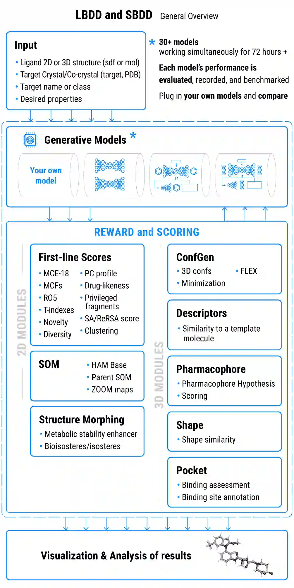 Chemistry42 is a software platform for de novo small molecule design that integrates Artificial Intelligence (AI) techniques with computational and medicinal chemistry methods. Chemistry42 is unique in its ability to generate novel molecular structures with predefined properties validated through in vitro and in vivo studies. Chemistry42 is a core component of Insilico Medicine Pharma.ai drug discovery suite that also includes target discovery and multi-omics data analysis (PandaOmics) and clinical trial outcomes predictions (InClinico).