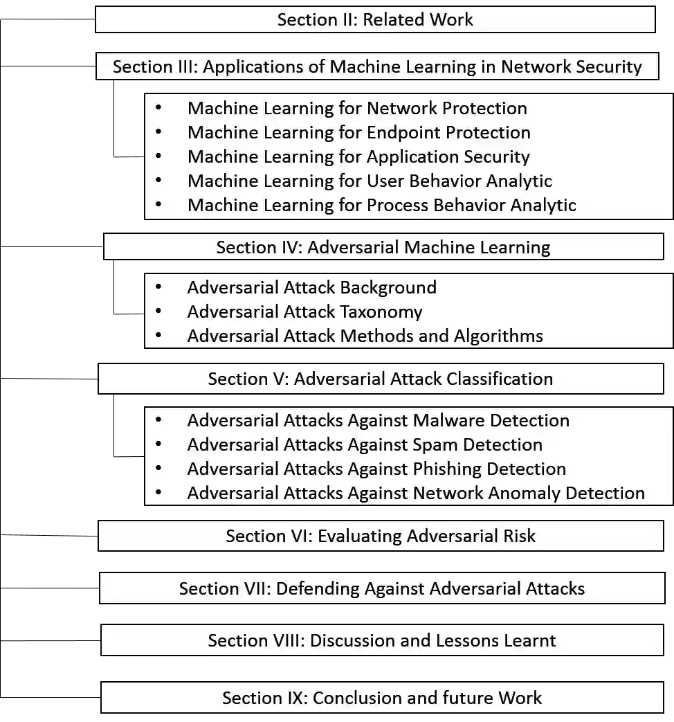 机器学习模型已经使得许多决策支持系统更快、更准确、更高效。然而,在网络安全中应用机器学习面临着比其他领域更加不成比例的对抗性攻击威胁。这是因为机器学习在网络安全领域的应用,如恶意软件检测、入侵检测和垃圾邮件过滤本身就具有对抗性。在攻击者和防御者之间的一场所谓的“军备竞赛”中,对手不断利用专门设计的输入来探测机器学习系统,以绕过系统并诱导错误预测。在本次调查中,我们首先提供了机器学习技术、任务和深度的分类方式。我们接着介绍了网络安全应用中的机器学习分类。接下来,我们分析了针对网络安全中的机器学习的各种对抗性攻击,并引入了两种基于分类的网络安全中的对抗性攻击方法。首先,我们根据网络安全应用程序的分类方法,将针对网络安全的对抗性攻击进行分类。其次,我们将网络安全中的对抗性攻击分类成问题空间 vs 特征空间的分类模型。然后,我们分析了针对基于机器学习的网络安全应用程序的各种防御。最后,我们引入了一个对抗性风险网格图,并使用该风险网格图评估了针对网络安全中机器学习的若干现有对抗性攻击。我们还确定每种攻击分类在对抗性风险网格图中的位置。