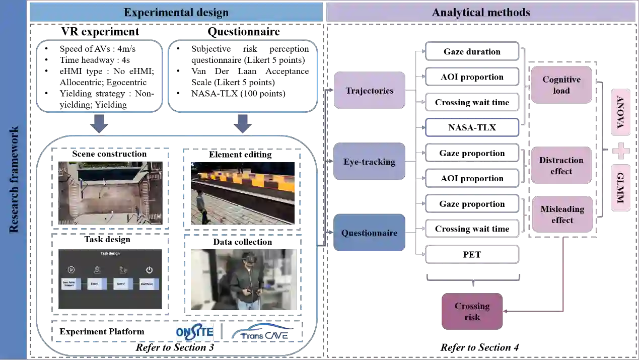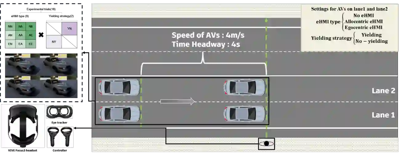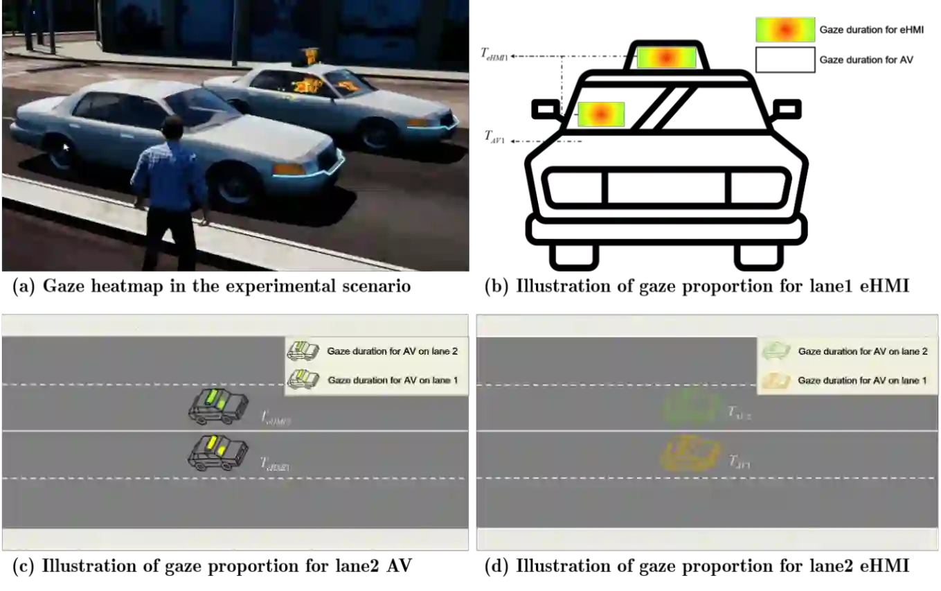 翻译:适当的沟通对于行人与自动驾驶车辆(AVs)之间高效且安全的交互至关重要。自动驾驶车辆上的外部人机界面(eHMIs)——可分为非自我中心型(allocentric)与自我中心型(egocentric)——被视为一种有前景的解决方案。尽管eHMIs的有效性已得到广泛研究,但在复杂环境(如无信号灯的多车道街道)中,其可能干扰行人过街行为的潜力仍未得到充分探索。为此,本研究开展了一项基于虚拟现实的实验,旨在探究自动驾驶车辆上显示的不同类型eHMIs如何影响行人在多车道街道环境中的过街行为,并重点关注行人过街过程中的注视模式。结果表明,eHMIs的存在显著影响了行人的认知负荷,增加了分心的可能性,甚至在涉及多车道街道上多辆自动驾驶车辆的情况下误导了行人。值得注意的是,与非自我中心型eHMIs相比,自我中心型eHMIs引发了行人更高的认知负荷和更严重的分心。这主要体现在:对交互车辆上eHMI的注视时间更长、注意力比例更高,以及对非交互车道车辆的注视分布更广。然而,误导行为主要由非交互车道中礼让车辆的eHMI信号触发。在此类非对称信号配置下,自我中心型eHMIs导致的误判率高于非自我中心型eHMIs。这些发现凸显了改进eHMI设计以平衡不同视角下所显示信息的清晰度与一致性的重要性,尤其是在复杂的多车道交通场景中。本研究为未来自动驾驶车辆eHMI系统的应用与标准化提供了有价值的见解。