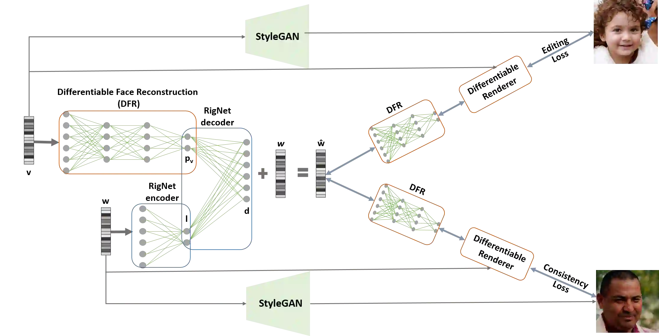 翻译:StyleGAN 生成有眼睛、牙齿、头发和背景面部( 颈部、 肩膀、 背景) 照片真实化的图像,但缺乏对3D 中可解释的语义表情参数( 如面容、 表达式和场景光化) 的像样控制。 另一面的三维可变形面型模型( 3DM ) 提供了对语义参数( 3DM ) 的控制, 但是在制作时缺乏光真化, 仅模拟面部内部, 而不是肖像的其他部分( 头发、 嘴内部、 背景) 。 我们展示了第一个方法, 通过 3DMM 来提供对一个预先培训和固定的 StyleGAN 进行像像面部位控制的方法。 一个新的操控网络, RigNet 在 3DM MM 的语义参数和 StyGAN 输入器之间接受培训。 网络以自我监督的方式培训, 不需要手动说明。 在测试时, 我们的方法生成像像像像像像像像像像一样的图像,, 并且对面的3D 语义参数提供明确的控制 。