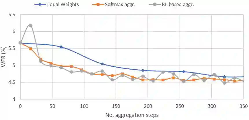 In this paper, a new learning algorithm for Federated Learning (FL) is introduced. The proposed scheme is based on a weighted gradient aggregation using two-step optimization to offer a flexible training pipeline. Herein, two different flavors of the aggregation method are presented, leading to an order of magnitude improvement in convergence speed compared to other distributed or FL training algorithms like BMUF and FedAvg. Further, the aggregation algorithm acts as a regularizer of the gradient quality. We investigate the effect of our FL algorithm in supervised and unsupervised Speech Recognition (SR) scenarios. The experimental validation is performed based on three tasks: first, the LibriSpeech task showing a speed-up of 7x and 6% word error rate reduction (WERR) compared to the baseline results. The second task is based on session adaptation providing 20% WERR over a powerful LAS model. Finally, our unsupervised pipeline is applied to the conversational SR task. The proposed FL system outperforms the baseline systems in both convergence speed and overall model performance.