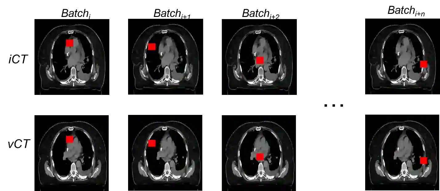 方法:开发了一个基于视觉变换块的非对称自动编码器网络。数据来自1个头颈部患者:2个正交的kV图像(1024x1024体素)、1个带填充的3D CT(512x512x512),在取得kV图像之前从射线CT-On-Rails中获取,以及基于CT的2个数字重建放射学图像(DRR)(512x512)。我们每隔8个体素对kV图像进行采样,每隔4个体素对DRR和CT进行采样,从而形成了一个由262144个样本组成的数据集,其中每个方向的图像的尺寸为128。在训练中,同时利用了kV和DRR图像,并鼓励编码器从两种图像中学习联合特征图。在测试中,仅使用独立的kV图像。通过按照它们的空间信息连接模型生成的sCT的sCT连接,实现了全尺寸的合成CT(sCT)。使用平均绝对误差(MAE)和每体素绝对CT数字差异体积直方图(CDVH)评估了合成CT(sCT)的图像质量。