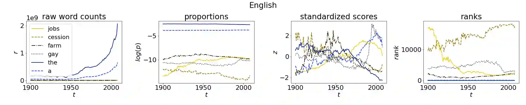 翻译:大型语言数据集的可用性使得以数据驱动的方式来研究语言变化。 这项工作通过调查Google Books Pasper ungram频率数据集来探索八种语言的字级动态。 我们观察了从1900年到2008年单数的级别变化,并将其与我们为分析而开发的Wright- Fisher启发型模型进行了比较。 模型模拟了一个中立的进化过程, 限制没有消失的单词。 这项工作解释了模型的数学框架 — 写成具有多重过渡概率的Markov链条 — 以显示文字在时间上的频率变化。 从我们在数据和模型中的观察看, 字级稳定性显示了两种特征:(1) 单调的军衔增加/减少, 或者说普通军衔保持不变。 根据我们的模型, 高调的单调的词往往更加稳定, 而低调的单词则比较不稳定。 以两种方式排列的词级变化:(a) 通过在时间上小增/定级的变化,以及(b) 通过在级别上增/降级的冲击, 单级显示两种特性的特性。 多数中阶语言在纯级中, 级的顺序上显示的是, 不变的顺序是稳定的顺序。