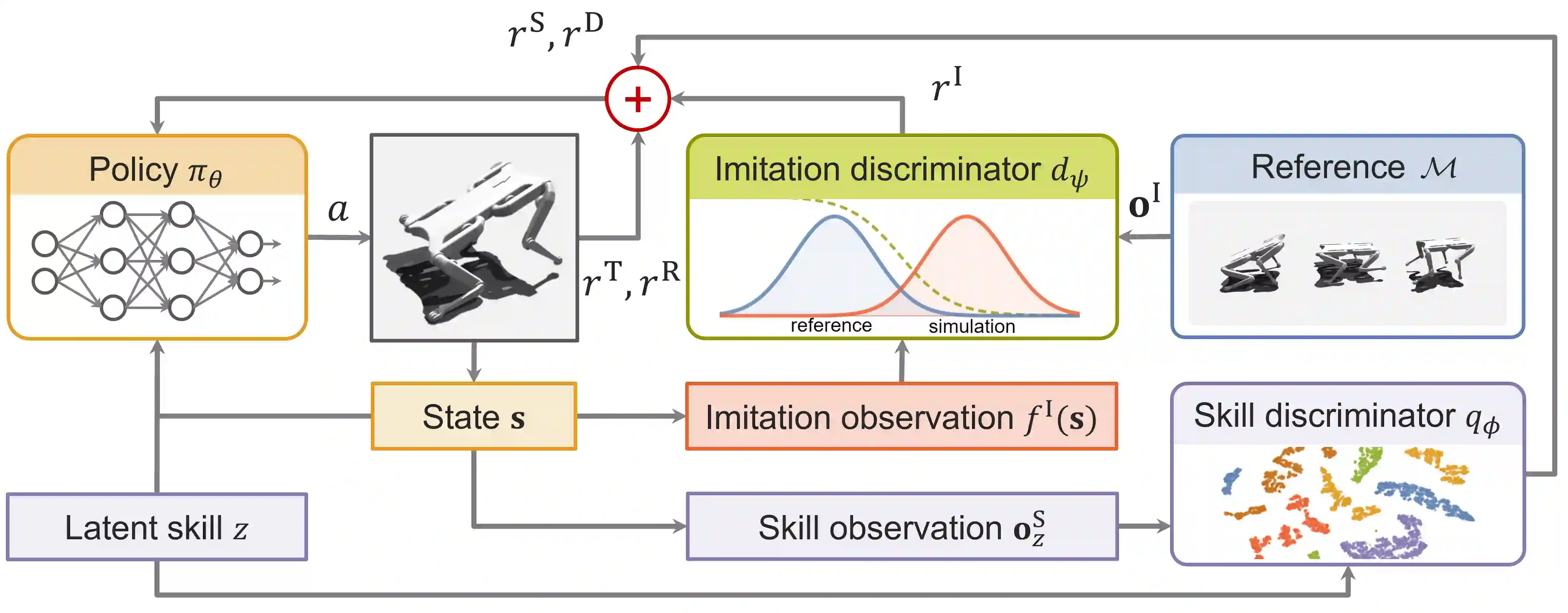 翻译:学习不同技能是机器人的主要挑战之一。 为此,模仿学习方法已经取得了令人印象深刻的成果。 这些方法需要明确标注的数据集或进行一致的技能执行,以便能够学习和积极控制个人行为,从而限制其适用性。 在这项工作中,我们提出一种合作对抗方法,通过最大限度地扩大差异,从包含不同状态过渡模式的未标定数据集中获取单一的多功能政策及其可控技能套件。 此外,我们表明,通过在基因化对抗模仿学习框架中利用未经监督的技能发现,新颖和有用的技能随着任务的顺利完成而出现。 最后,获得的多功能政策在名为Solo 8的敏捷的四重四重机器人上进行测试,并展示演示中所编码的各种技能的忠实复制。