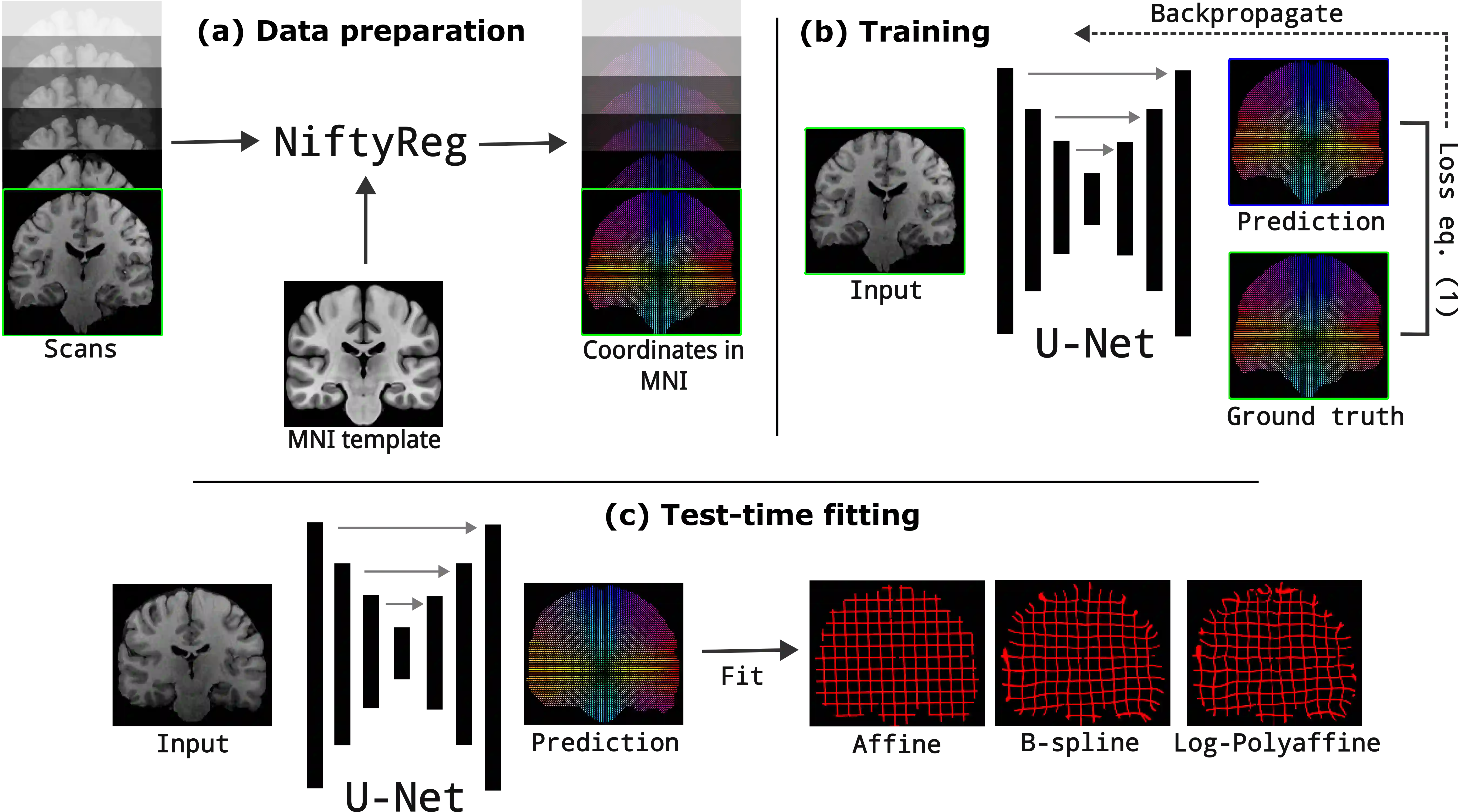 In human neuroimaging studies, atlas registration enables mapping MRI scans to a common coordinate frame, which is necessary to aggregate data from multiple subjects. Machine learning registration methods have achieved excellent speed and accuracy but lack interpretability. More recently, keypoint-based methods have been proposed to tackle this issue, but their accuracy is still subpar, particularly when fitting nonlinear transforms. Here we propose Registration by Regression (RbR), a novel atlas registration framework that is highly robust and flexible, conceptually simple, and can be trained with cheaply obtained data. RbR predicts the (x,y,z) atlas coordinates for every voxel of the input scan (i.e., every voxel is a keypoint), and then uses closed-form expressions to quickly fit transforms using a wide array of possible deformation models, including affine and nonlinear (e.g., Bspline, Demons, invertible diffeomorphic models, etc.). Robustness is provided by the large number of voxels informing the registration and can be further increased by robust estimators like RANSAC. Experiments on independent public datasets show that RbR yields more accurate registration than competing keypoint approaches, while providing full control of the deformation model.