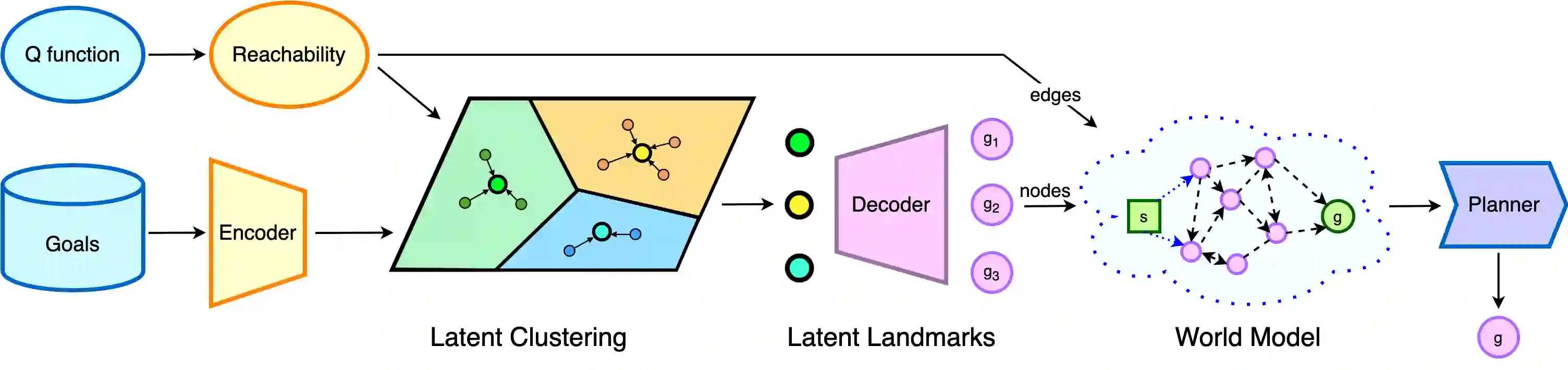 Planning - the ability to analyze the structure of a problem in the large and decompose it into interrelated subproblems - is a hallmark of human intelligence. While deep reinforcement learning (RL) has shown great promise for solving relatively straightforward control tasks, it remains an open problem how to best incorporate planning into existing deep RL paradigms to handle increasingly complex environments. One prominent framework, Model-Based RL, learns a world model and plans using step-by-step virtual rollouts. This type of world model quickly diverges from reality when the planning horizon increases, thus struggling at long-horizon planning. How can we learn world models that endow agents with the ability to do temporally extended reasoning? In this work, we propose to learn graph-structured world models composed of sparse, multi-step transitions. We devise a novel algorithm to learn latent landmarks that are scattered (in terms of reachability) across the goal space as the nodes on the graph. In this same graph, the edges are the reachability estimates distilled from Q-functions. On a variety of high-dimensional continuous control tasks ranging from robotic manipulation to navigation, we demonstrate that our method, named L3P, significantly outperforms prior work, and is oftentimes the only method capable of leveraging both the robustness of model-free RL and generalization of graph-search algorithms. We believe our work is an important step towards scalable planning in reinforcement learning.