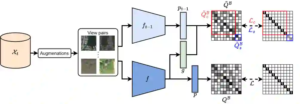 翻译:持续自监督学习(CSSL)方法因其能够从连续的无标注数据流中顺序学习新任务的能力,在遥感(RS)领域受到越来越多的关注。现有的CSSL方法在学习新任务时,主要侧重于防止灾难性遗忘。为此,它们大多采用正则化策略来保留先前任务的知识。但这会降低模型适应新任务数据的能力(即学习可塑性),从而可能损害性能。为了解决这个问题,本文提出了一种新颖的CSSL方法,旨在顺序学习任务的同时,实现较高的学习可塑性。为此,所提出的方法采用了一种集成解耦机制的知识蒸馏策略。该解耦首先通过将特征维度划分为任务通用部分和任务特定部分来实现。然后,强制任务通用特征之间具有相关性以确保记忆稳定性,同时强制任务特定特征之间去相关以促进新特征的学习。实验结果表明,与广泛使用的CSSL框架CaSSLe相比,所提方法具有有效性:在任务增量场景下,平均准确率提升高达1.12%,顽固性提升2.33%;在类别增量场景下,平均准确率提升1.24%,顽固性提升2.01%。