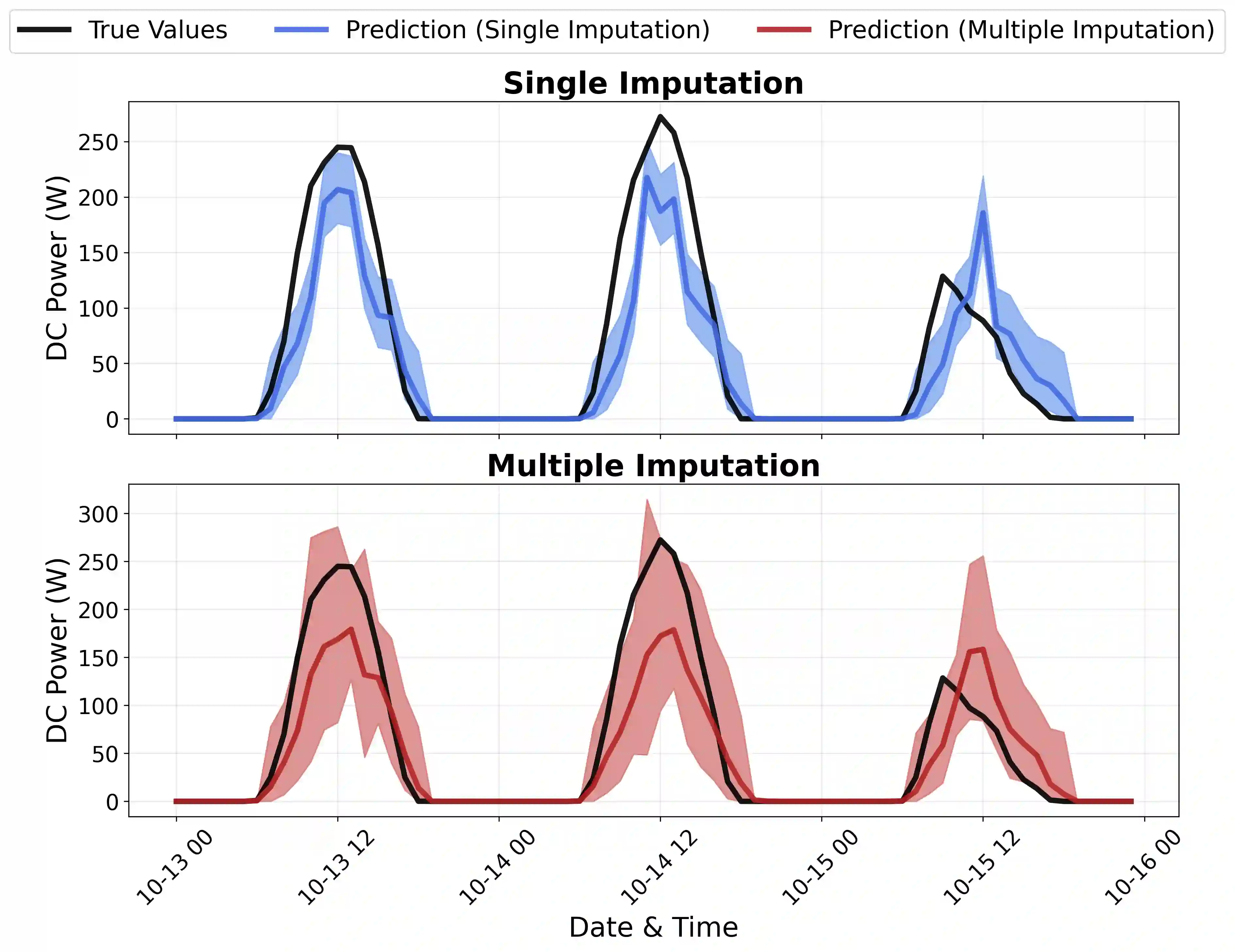 翻译:光伏发电数据中普遍存在缺失值,然而这些缺失值所引发的不确定性并未被传递至预测分布中。本文通过将随机多重插补与Rubin规则相结合,构建了一个将缺失数据不确定性纳入光伏短期预测的框架。该方法具有模型无关性,可与标准的机器学习预测器集成。实证结果表明,忽略缺失数据不确定性会导致预测区间过度狭窄。考虑这种不确定性可在保持可比点预测精度的同时改善区间校准效果。这些结果证明了在数据驱动的光伏预测中传递插补不确定性的重要性。