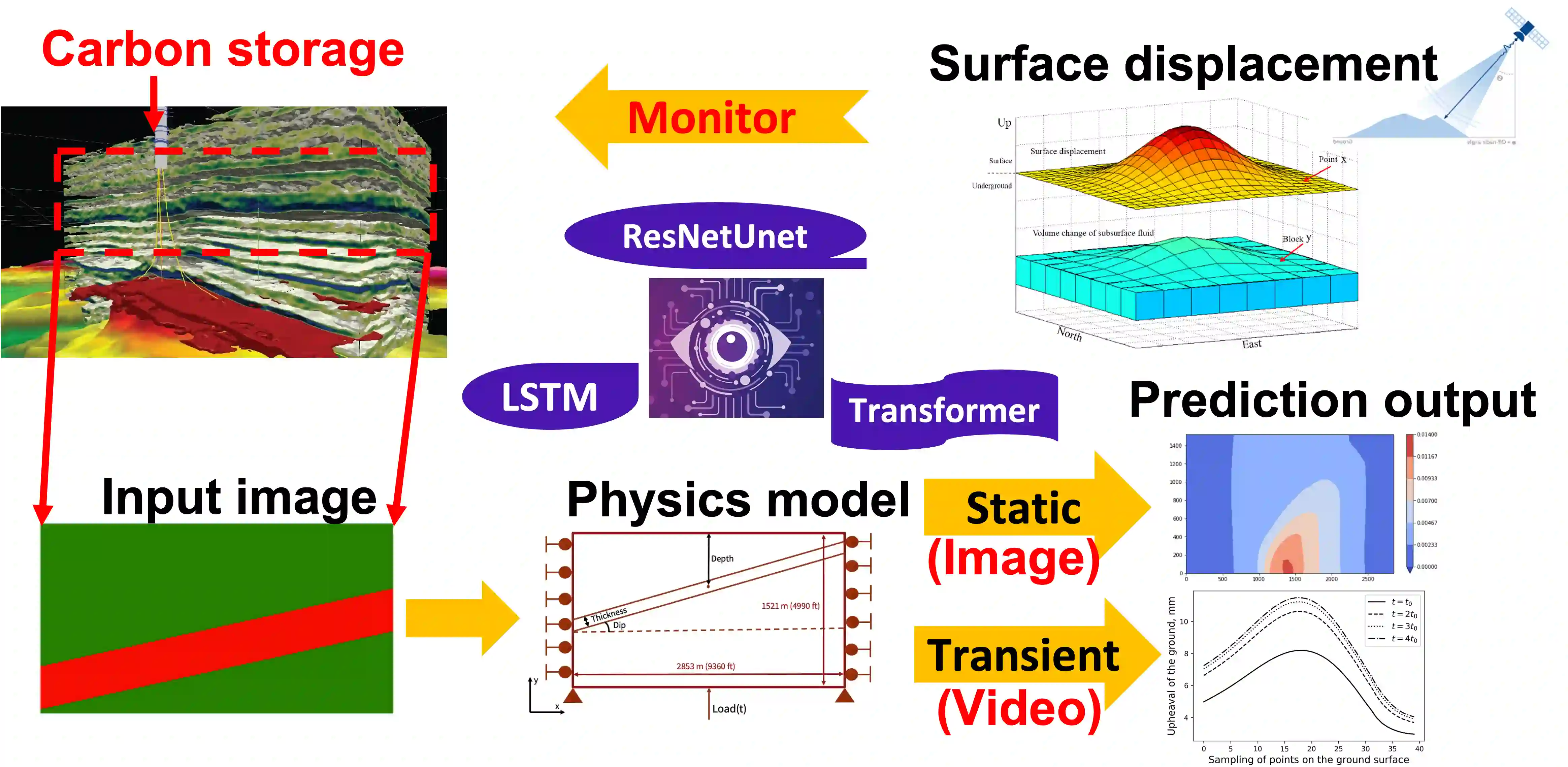 We introduce a new approach using computer vision to predict the land surface displacement from subsurface geometry images for Carbon Capture and Sequestration (CCS). CCS has been proved to be a key component for a carbon neutral society. However, scientists see there are challenges along the way including the high computational cost due to the large model scale and limitations to generalize a pre-trained model with complex physics. We tackle those challenges by training models directly from the subsurface geometry images. The goal is to understand the respons of land surface displacement due to carbon injection and utilize our trained models to inform decision making in CCS projects. We implement multiple models (CNN, ResNet, and ResNetUNet) for static mechanics problem, which is a image prediction problem. Next, we use the LSTM and transformer for transient mechanics scenario, which is a video prediction problem. It shows ResNetUNet outperforms the others thanks to its architecture in static mechanics problem, and LSTM shows comparable performance to transformer in transient problem. This report proceeds by outlining our dataset in detail followed by model descriptions in method section. Result and discussion state the key learning, observations, and conclusion with future work rounds out the paper.