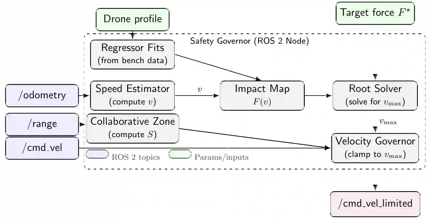 Indoor micro-aerial vehicles (MAVs) are increasingly used for tasks that require close proximity to people, yet practitioners lack practical methods to tune motion limits based on measured impact risk. We present an end-to-end, open toolchain that converts benchtop impact tests into deployable safety governors for drones. First, we describe a compact and replicable impact rig and protocol for capturing force-time profiles across drone classes and contact surfaces. Second, we provide data-driven models that map pre-impact speed to impulse and contact duration, enabling direct computation of speed bounds for a target force limit. Third, we release scripts and a ROS2 node that enforce these bounds online and log compliance, with support for facility-specific policies. We validate the workflow on multiple commercial off-the-shelf quadrotors and representative indoor assets, demonstrating that the derived governors preserve task throughput while meeting force constraints specified by safety stakeholders. Our contribution is a practical bridge from measured impacts to runtime limits, with shareable datasets, code, and a repeatable process that teams can adopt to certify indoor MAV operations near humans.