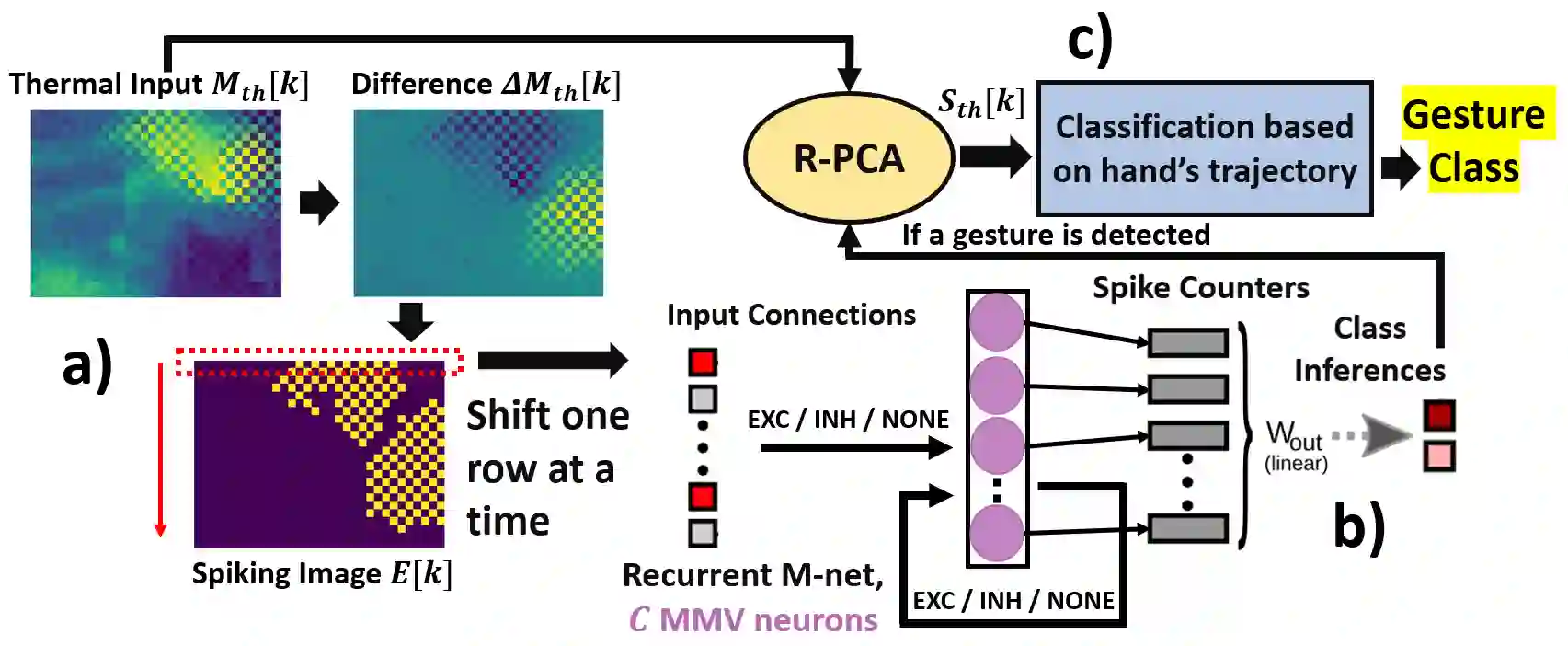 This work proposes a novel approach for hand gesture recognition using an inexpensive, low-resolution (24 x 32) thermal sensor processed by a Spiking Neural Network (SNN) followed by Sparse Segmentation and feature-based gesture classification via Robust Principal Component Analysis (R-PCA). Compared to the use of standard RGB cameras, the proposed system is insensitive to lighting variations while being significantly less expensive compared to high-frequency radars, time-of-flight cameras and high-resolution thermal sensors previously used in literature. Crucially, this paper shows that the innovative use of the recently proposed Monostable Multivibrator (MMV) neural networks as a new class of SNN achieves more than one order of magnitude smaller memory and compute complexity compared to deep learning approaches, while reaching a top gesture recognition accuracy of 93.9% using a 5-class thermal camera dataset acquired in a car cabin, within an automotive context. Our dataset is released for helping future research.