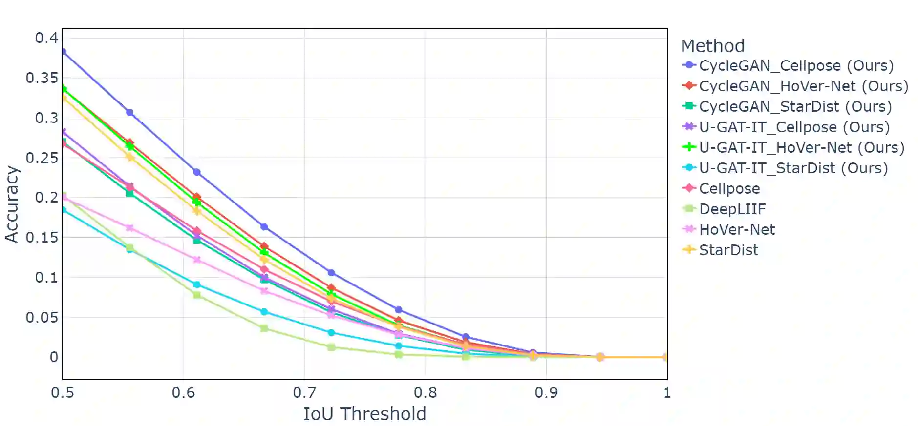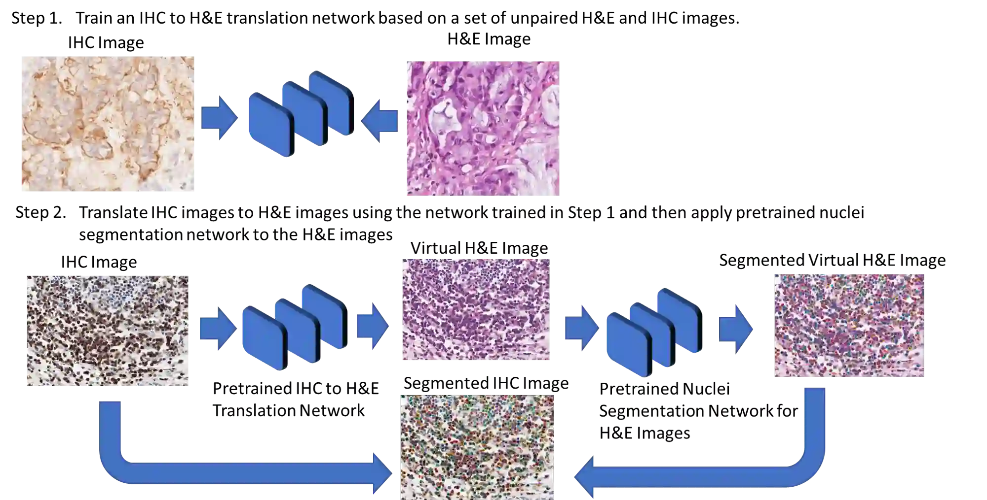 翻译:已经为H&E图像的核分离开发了许多基于深层次学习的方法,这些方法已经接近人类的性能,然而,将这类方法直接应用到另一种图像模式,如Immunohistechicistry(IHC)图像,可能无法取得令人满意的性能。因此,我们开发了一种基于基因的反向网络(GAN)方法,将IHC图像转化为H&E图像,同时保留核心位置和形态学,然后对虚拟H&E图像应用预先训练的核分离模型。 我们证明,拟议方法比几种基线方法效果更好,包括直接应用诸如Cellpose和HVer-Net(Cellpose)等艺术核分离法状态和GeepLIIF(TeepLIF,使用两个公开的IHC图像数据集)。