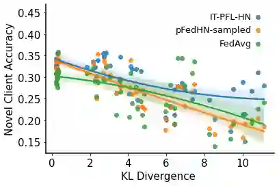 In Federated learning (FL), multiple clients collaborate to learn a shared model through a central server while they keep data decentralized. Personalized federated learning (PFL) further extends FL by learning personalized models per client. In both FL and PFL, all clients participate in the training process and their labeled data is used for training. However, in reality, novel clients may wish to join a prediction service after it has been deployed, obtaining predictions for their own unlabeled data. Here, we introduce a new learning setup, Inference-Time Unlabeled PFL (ITU-PFL), where a system trained on a set of clients, needs to be later applied to novel unlabeled clients at inference time. We propose a novel approach to this problem, ITUFL-HN, which uses a hypernetwork to produce a new model for the late-to-the-party client. Specifically, we train an encoder network that learns a representation for a client given its unlabeled data. That client representation is fed to a hypernetwork that generates a personalized model for that client. Evaluated on five benchmark datasets, we find that ITUFL-HN generalizes better than current FL and PFL methods, especially when the novel client has a large domain shift from training clients. We also analyzed the generalization error for novel clients, and showed analytically and experimentally how they can apply differential privacy to their data.
