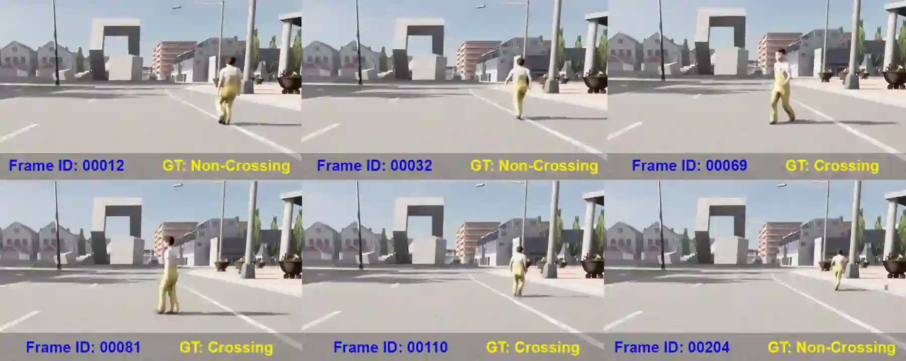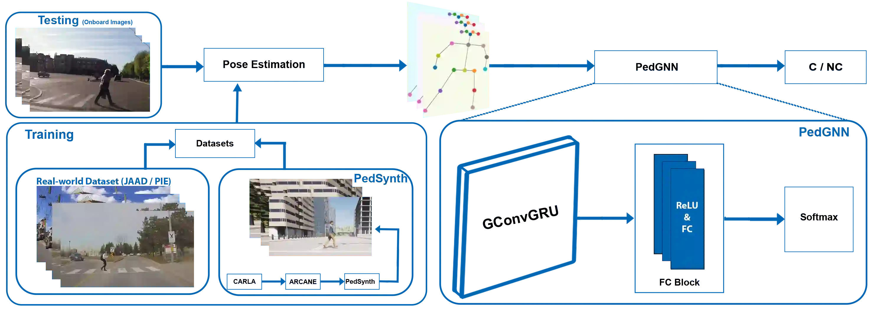 Pedestrian intention prediction is crucial for autonomous driving. In particular, knowing if pedestrians are going to cross in front of the ego-vehicle is core to performing safe and comfortable maneuvers. Creating accurate and fast models that predict such intentions from sequential images is challenging. A factor contributing to this is the lack of datasets with diverse crossing and non-crossing (C/NC) scenarios. We address this scarceness by introducing a framework, named ARCANE, which allows programmatically generating synthetic datasets consisting of C/NC video clip samples. As an example, we use ARCANE to generate a large and diverse dataset named PedSynth. We will show how PedSynth complements widely used real-world datasets such as JAAD and PIE, so enabling more accurate models for C/NC prediction. Considering the onboard deployment of C/NC prediction models, we also propose a deep model named PedGNN, which is fast and has a very low memory footprint. PedGNN is based on a GNN-GRU architecture that takes a sequence of pedestrian skeletons as input to predict crossing intentions.