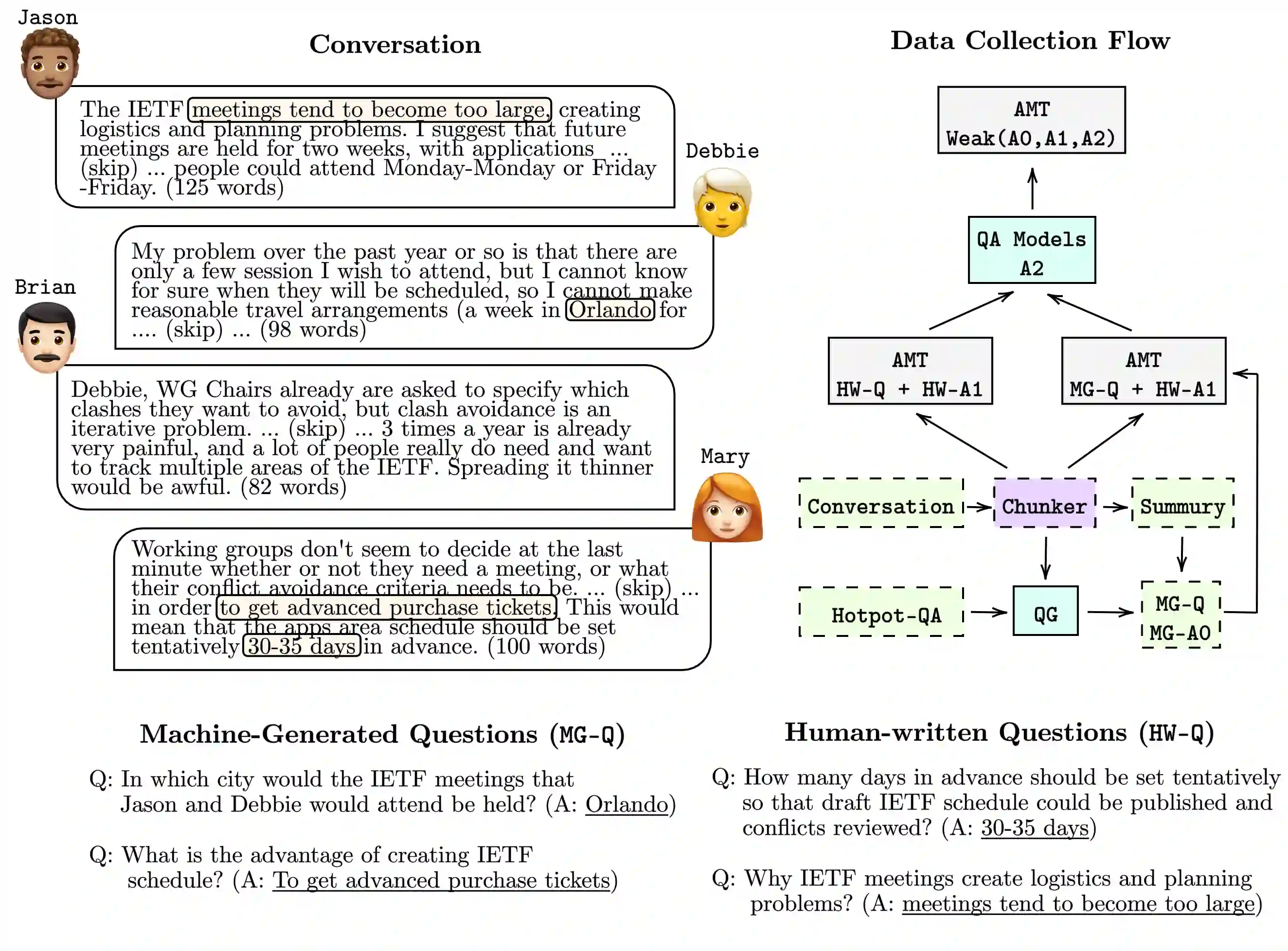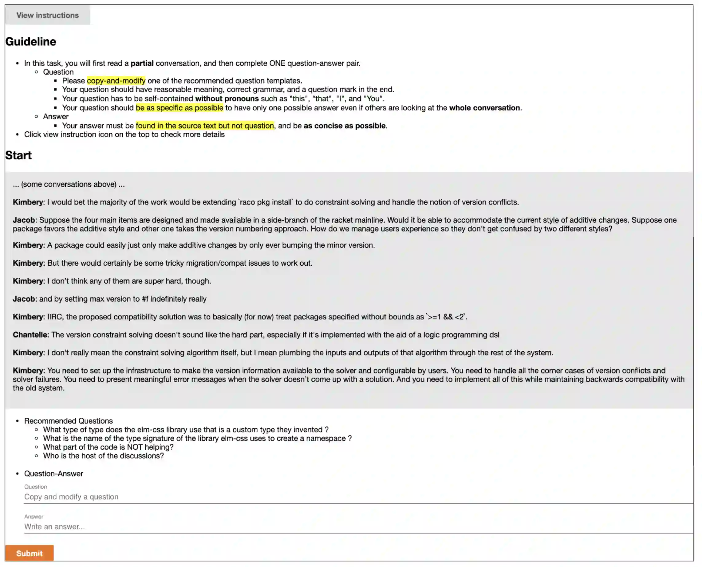 翻译:本文介绍QAConv(QAConv),这是一个使用对话作为知识来源的新答题(QA)数据集。我们侧重于信息性对话,包括商业电子邮件、小组讨论和工作渠道。与开放域和面向任务的对话不同,这些对话通常长、复杂、不同步,涉及强大的域知识。总的来说,我们收集了34 204对QA,包括基于跨域、自由形式和无法回答的问题,从10 259个选定的与人造和机器生成的问题的对话中收集。我们将长段对话分到块中,使用问题生成器和对话摘要作为收集多跳点问题的辅助工具。数据集有两个测试情景,即块模式和完整模式,取决于是否提供或从大型对话库中检索了块块。实验结果表明,在现有QA数据集培训的先进QA系统,其零点能力有限,而且倾向于预测我们的问题无法回答。对我们的系统进行微调,在块和完整模式中,分别实现23.6%和13.6%的重大改进。