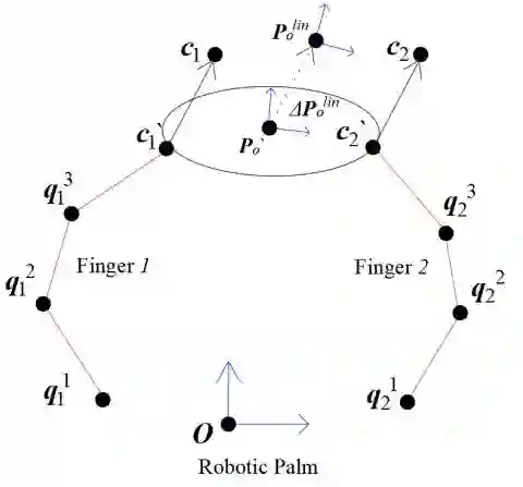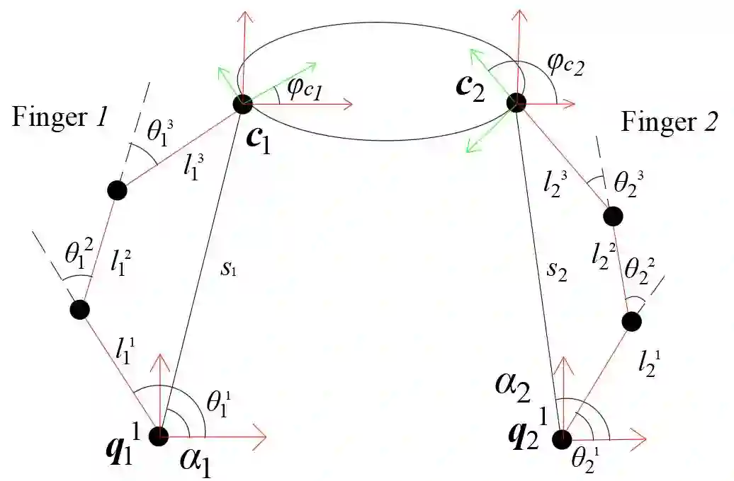 This paper addresses the planar finger kinematics for seeking optimized manipulation strategies. The first step is to model based on geometric features of linear and rotation motion so that the robot can select the fingers configurations. This kinematic model considers the motion between hands and object. Based on 2-finger manipulation cases, this model can output the strategies for bimanual manipulation. For executing strategies, the second step is to seek the appropriate values of finger joints according to the ending orientation of fingers. The simulation shows that the computed solutions can complete the relative rotation and linear motion of unknown objects.