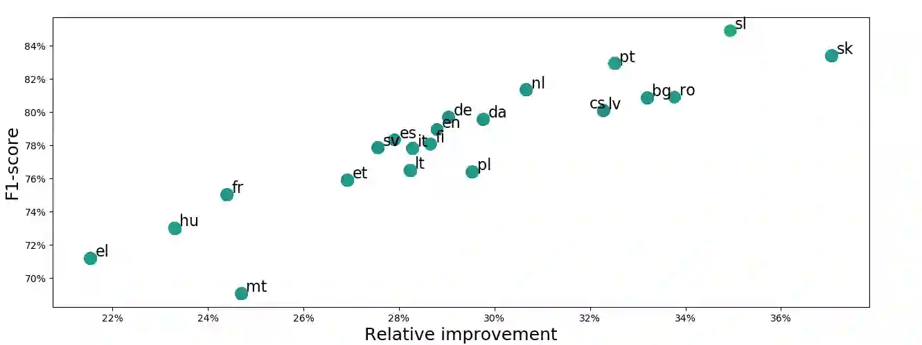 翻译:EuroVoc是一个多语种的术语词库,是为组织欧洲联盟机构的立法文件而建造的,它包括了数千个不同具体程度的类别,其说明以近30种语言的法律文本为对象;在这项工作中,我们提议了22种语言的EuroVoc分类统一框架,通过微调基于现代变压器的预先培训语言模型进行微调;我们广泛研究我们经过培训的模型的性能,并表明它们大大改进了同一数据集上类似工具JEX获得的结果;代码和经过精细调整的模型是开放的,同时有一个方案界面,可以减轻经过培训的模型的重量和新文件的分类过程。