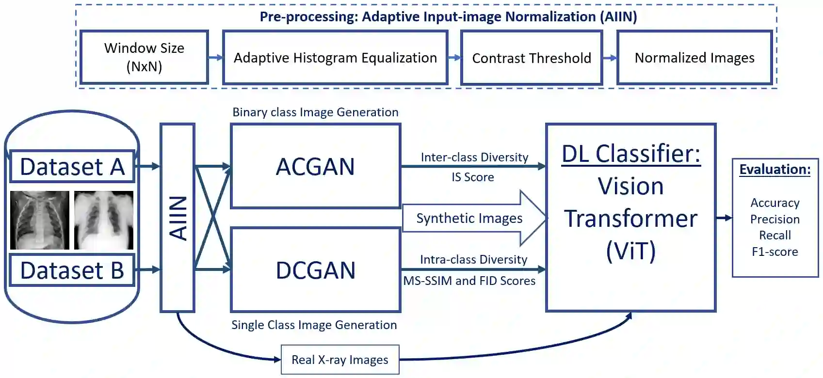 Biomedical image datasets can be imbalanced due to the rarity of targeted diseases. Generative Adversarial Networks play a key role in addressing this imbalance by enabling the generation of synthetic images to augment datasets. It is important to generate synthetic images that incorporate a diverse range of features to accurately represent the distribution of features present in the training imagery. Furthermore, the absence of diverse features in synthetic images can degrade the performance of machine learning classifiers. The mode collapse problem impacts Generative Adversarial Networks' capacity to generate diversified images. Mode collapse comes in two varieties: intra-class and inter-class. In this paper, both varieties of the mode collapse problem are investigated, and their subsequent impact on the diversity of synthetic X-ray images is evaluated. This work contributes an empirical demonstration of the benefits of integrating the adaptive input-image normalization with the Deep Convolutional GAN and Auxiliary Classifier GAN to alleviate the mode collapse problems. Synthetically generated images are utilized for data augmentation and training a Vision Transformer model. The classification performance of the model is evaluated using accuracy, recall, and precision scores. Results demonstrate that the DCGAN and the ACGAN with adaptive input-image normalization outperform the DCGAN and ACGAN with un-normalized X-ray images as evidenced by the superior diversity scores and classification scores.