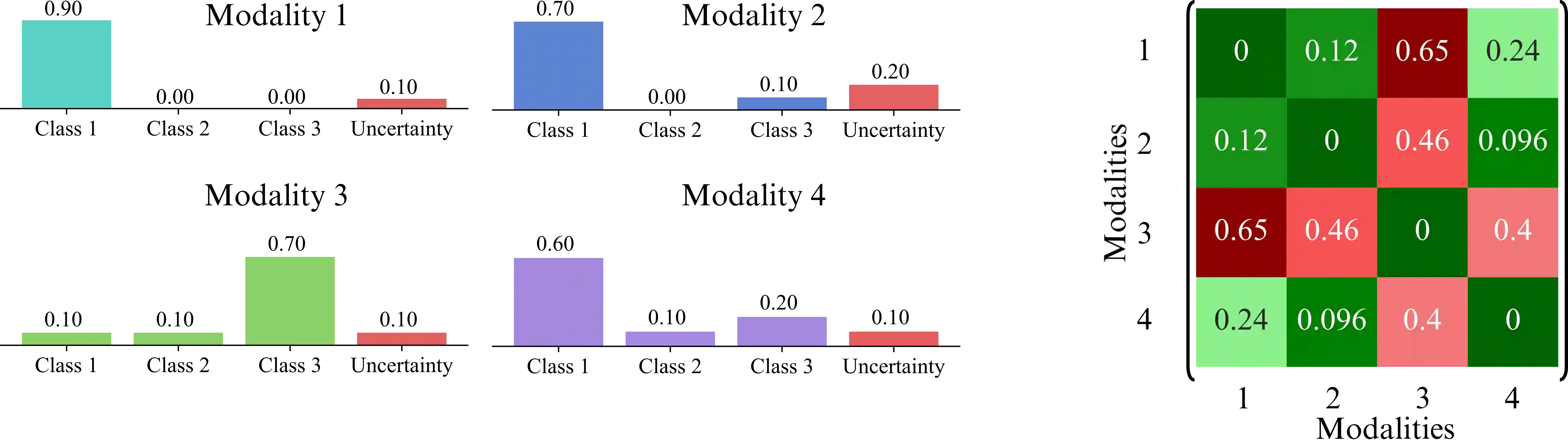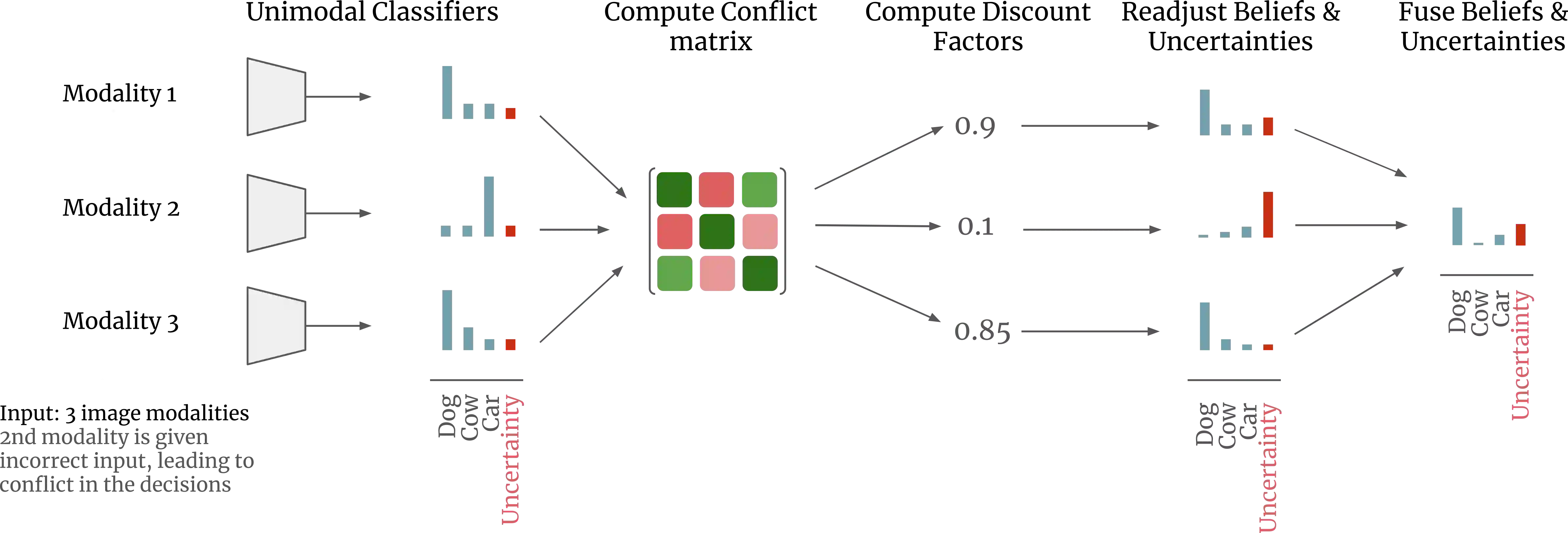 Multimodal AI models are increasingly used in fields like healthcare, finance, and autonomous driving, where information is drawn from multiple sources or modalities such as images, texts, audios, videos. However, effectively managing uncertainty - arising from noise, insufficient evidence, or conflicts between modalities - is crucial for reliable decision-making. Current uncertainty-aware machine learning methods leveraging, for example, evidence averaging, or evidence accumulation underestimate uncertainties in high-conflict scenarios. Moreover, the state-of-the-art evidence averaging strategy is not order invariant and fails to scale to multiple modalities. To address these challenges, we propose a novel multimodal learning method with order-invariant evidence fusion and introduce a conflict-based discounting mechanism that reallocates uncertain mass when unreliable modalities are detected. We provide both theoretical analysis and experimental validation, demonstrating that unlike the previous work, the proposed approach effectively distinguishes between conflicting and non-conflicting samples based on the provided uncertainty estimates, and outperforms the previous models in uncertainty-based conflict detection.