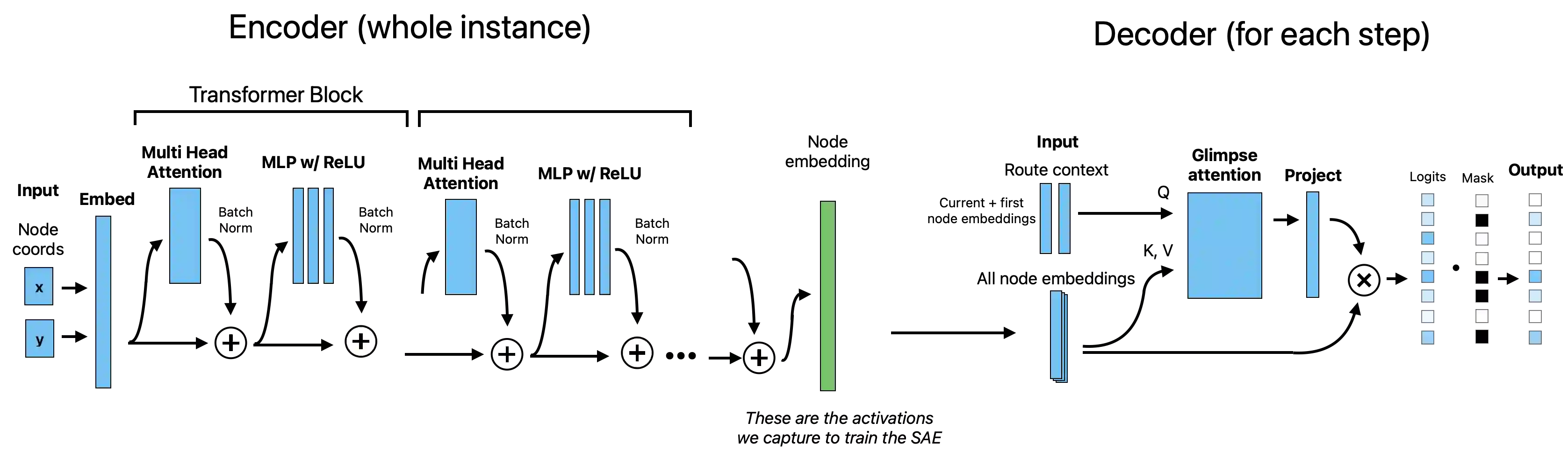 翻译:神经网络在组合优化领域取得了显著进展,基于Transformer的求解器能够在毫秒级时间内为旅行商问题(TSP)提供接近最优的解。然而,这些模型如同黑箱般运行,无法揭示其学习到的几何模式或在路径构建过程中采用的启发式策略。针对这一不透明性问题,我们首次将稀疏自编码器(SAEs)——一种机制可解释性技术——应用于基于Transformer的TSP求解器,这也是基于激活的可解释性方法在运筹学模型中的首次应用。我们在100节点规模的实例上通过强化学习训练指针网络,随后对编码器残差流拟合SAE,以发现过完备的可解释特征字典。分析表明,求解器自发形成了与TSP基础概念相对应的特征:在凸包节点上激活的边界检测器、对局部密集区域响应的聚类敏感特征,以及编码几何划分的分隔特征。这些发现首次从模型内部揭示了神经TSP求解器在节点选择前的计算机制,证明了无显式监督下几何结构的自发涌现,并为构建融合神经高效性与算法可解释性的透明混合系统提供了新路径。交互式特征探索平台:https://reubennarad.github.io/TSP_interp