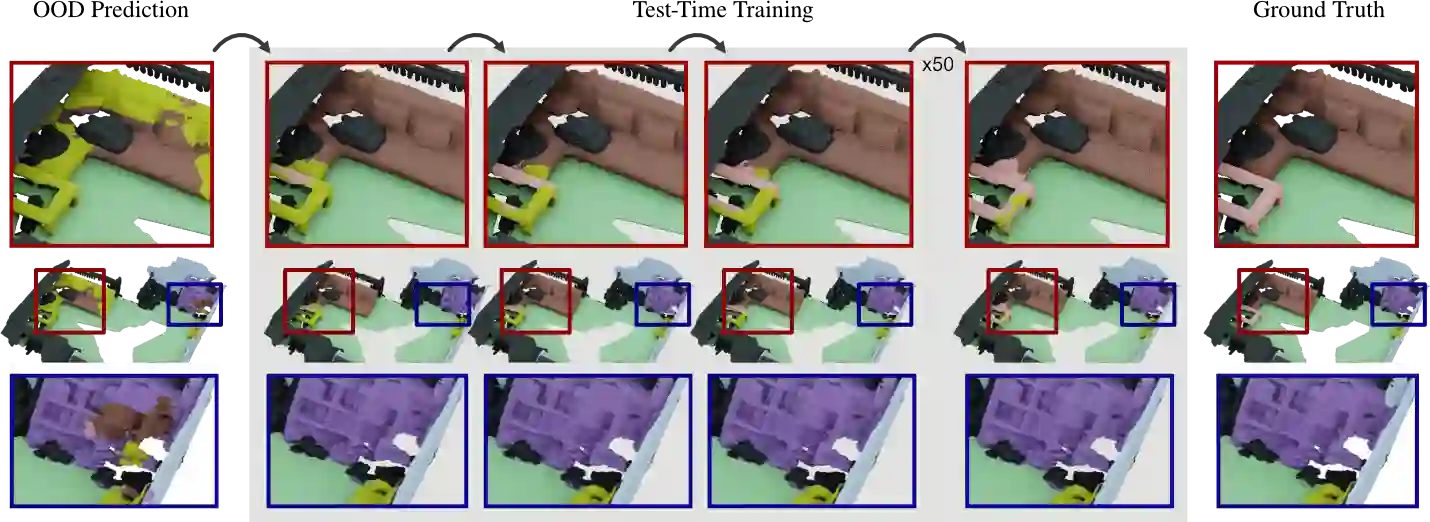 Test-Time Training (TTT) proposes to adapt a pre-trained network to changing data distributions on-the-fly. In this work, we propose the first TTT method for 3D semantic segmentation, TTT-KD, which models Knowledge Distillation (KD) from foundation models (e.g. DINOv2) as a self-supervised objective for adaptation to distribution shifts at test-time. Given access to paired image-pointcloud (2D-3D) data, we first optimize a 3D segmentation backbone for the main task of semantic segmentation using the pointclouds and the task of 2D $\to$ 3D KD by using an off-the-shelf 2D pre-trained foundation model. At test-time, our TTT-KD updates the 3D segmentation backbone for each test sample, by using the self-supervised task of knowledge distillation, before performing the final prediction. Extensive evaluations on multiple indoor and outdoor 3D segmentation benchmarks show the utility of TTT-KD, as it improves performance for both in-distribution (ID) and out-of-distribution (ODO) test datasets. We achieve a gain of up to 13% mIoU (7% on average) when the train and test distributions are similar and up to 45% (20% on average) when adapting to OOD test samples.