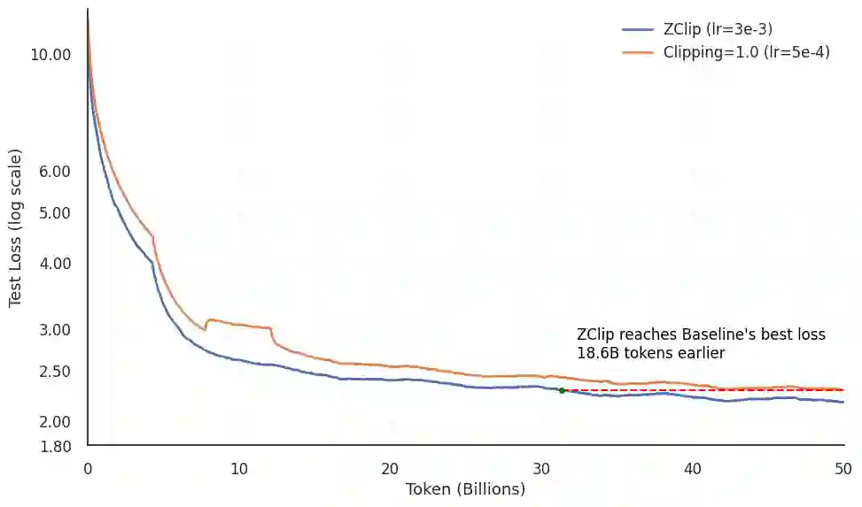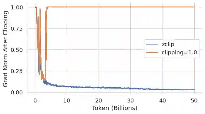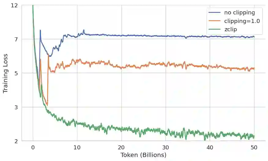 翻译:大语言模型(LLM)的训练面临诸多挑战,包括梯度不稳定性和损失值尖峰现象。这些现象可能导致灾难性发散,需要耗费大量资源进行检查点恢复和数据批次跳过。传统的梯度裁剪技术(如常数裁剪或基于范数的方法)由于依赖固定阈值或启发式规则,无法有效解决这些问题,导致学习效率低下且需要频繁的人工干预。本研究提出ZClip,一种自适应梯度裁剪算法,该算法基于梯度范数随时间变化的统计特性动态调整裁剪阈值。与以往的反应式策略不同,ZClip无需对梯度范数的尺度及时间演化做任何先验假设,即可主动适应训练动态。其核心在于利用基于z分数的异常检测机制来识别并缓解大幅梯度尖峰,从而在避免恶性损失尖峰的同时不影响模型的正常收敛。我们的代码已开源:https://github.com/bluorion-com/ZClip。