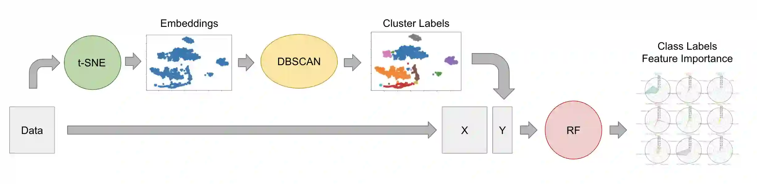 This research proposes a data segmentation algorithm which combines t-SNE, DBSCAN, and Random Forest classifier to form an end-to-end pipeline that separates data into natural clusters and produces a characteristic profile of each cluster based on the most important features. Out-of-sample cluster labels can be inferred, and the technique generalizes well on real data sets. We describe the algorithm and provide case studies using the Iris and MNIST data sets, as well as real social media site data from Instagram. This is a proof of concept and sets the stage for further in-depth theoretical analysis.