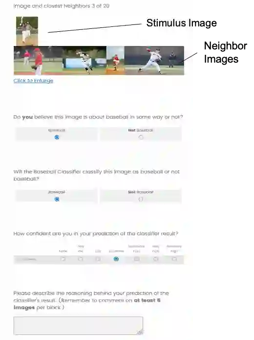 翻译:人类应该能够更有效地与人工智能系统合作,当它们能够预测可能的失败,并形成关于这些系统如何运作的有用的心理模型时。我们用高性能图像分类器对人工智能系统的人类心理模型进行了一项研究,重点是参与者预测特定图像分类结果的能力。参与者在两个类别中的一个中查看了贴有个人标签的图像,然后试图预测分类器是否正确贴上标签。在这个实验中,我们探讨了向参与者提供更多关于图像近邻的信息的效果,该图像的近邻空间代表了分类器神经网络下层所提取的无法解释的特征。我们发现,提供这种信息确实提高了参与者的预测性能,而且性能的改进可能与邻居图像与目标图像相似性有关。我们还发现了一些迹象,这种信息的展示可能会影响人们自己对目标图像的分类 -- 也就是说,而不仅仅是将系统进行人类形态化,在某些情况下,人类在判断中变成了“基因化”。