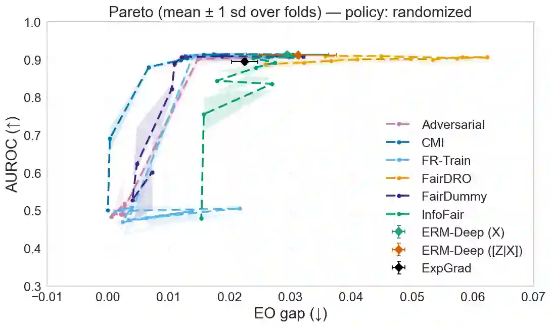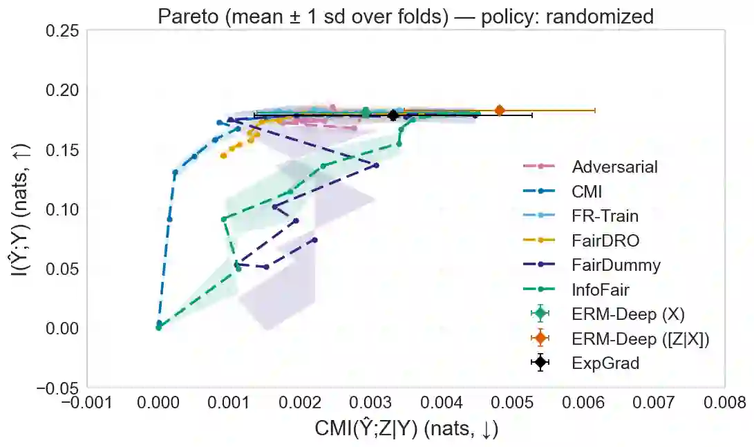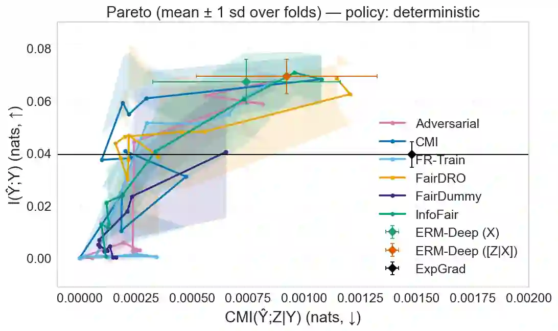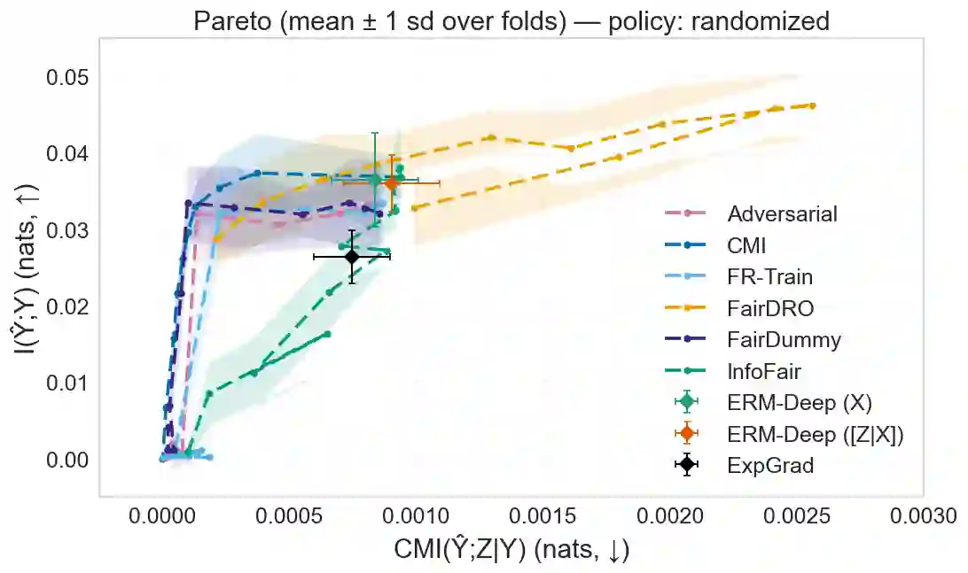 翻译:我们研究了效用与分离之间的帕累托前沿(最优权衡),其中分离是一种公平性准则,要求在给定真实结果的条件下,预测独立于敏感属性。通过信息论的视角,我们证明了效用-分离帕累托前沿的一个刻画,确立了其凹性,从而证明了分离在效用方面的边际成本递增。此外,我们刻画了这种权衡变得严格的条件,为实践中的权衡选择提供了指导。基于这一理论刻画,我们开发了一种基于预测与敏感属性在给定真实结果下的条件互信息(CMI)的经验正则化器。该CMI正则化器兼容任何通过基于梯度的优化训练的深度模型,并可作为残余分离违规的标量监控器,在训练过程中提供可处理的保证。最后,数值实验支持了我们的理论发现:在COMPAS、UCI Adult、UCI Bank和CelebA数据集上,所提出的方法在匹配或超越现有基线方法效用的同时,显著减少了分离违规。因此,本研究为在深度学习中实施分离提供了一种可证明、稳定且灵活的方法。