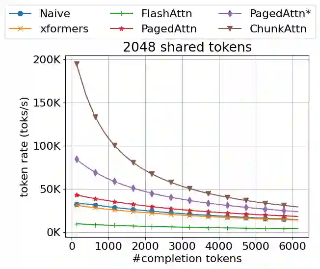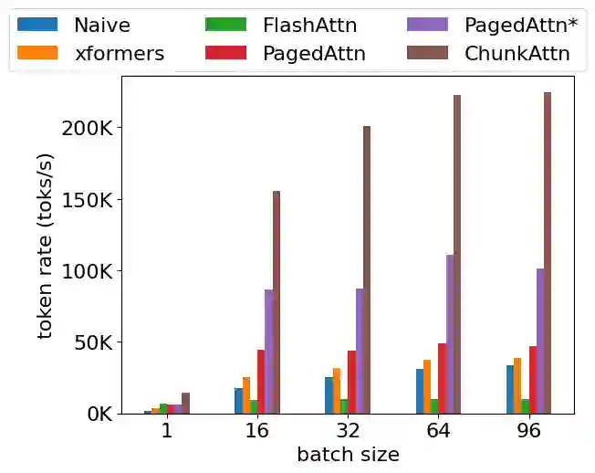 Self-attention is an essential component of large language models (LLM) but a significant source of inference latency for long sequences. In multi-tenant LLM serving scenarios, the compute and memory operation cost of self-attention can be optimized by using the probability that multiple LLM requests have shared system prompts in prefixes. In this paper, we introduce ChunkAttention, a prefix-aware self-attention module that can detect matching prompt prefixes across multiple requests and share their key/value tensors in memory at runtime to improve the memory utilization of KV cache. This is achieved by breaking monolithic key/value tensors into smaller chunks and structuring them into the auxiliary prefix tree. Consequently, on top of the prefix-tree based KV cache, we design an efficient self-attention kernel, where a two-phase partition algorithm is implemented to improve the data locality during self-attention computation in the presence of shared system prompts. Experiments show that ChunkAttention can speed up the self-attention kernel by 3.2-4.8$\times$ compared to the state-of-the-art implementation, with the length of the system prompt ranging from 1024 to 4096.