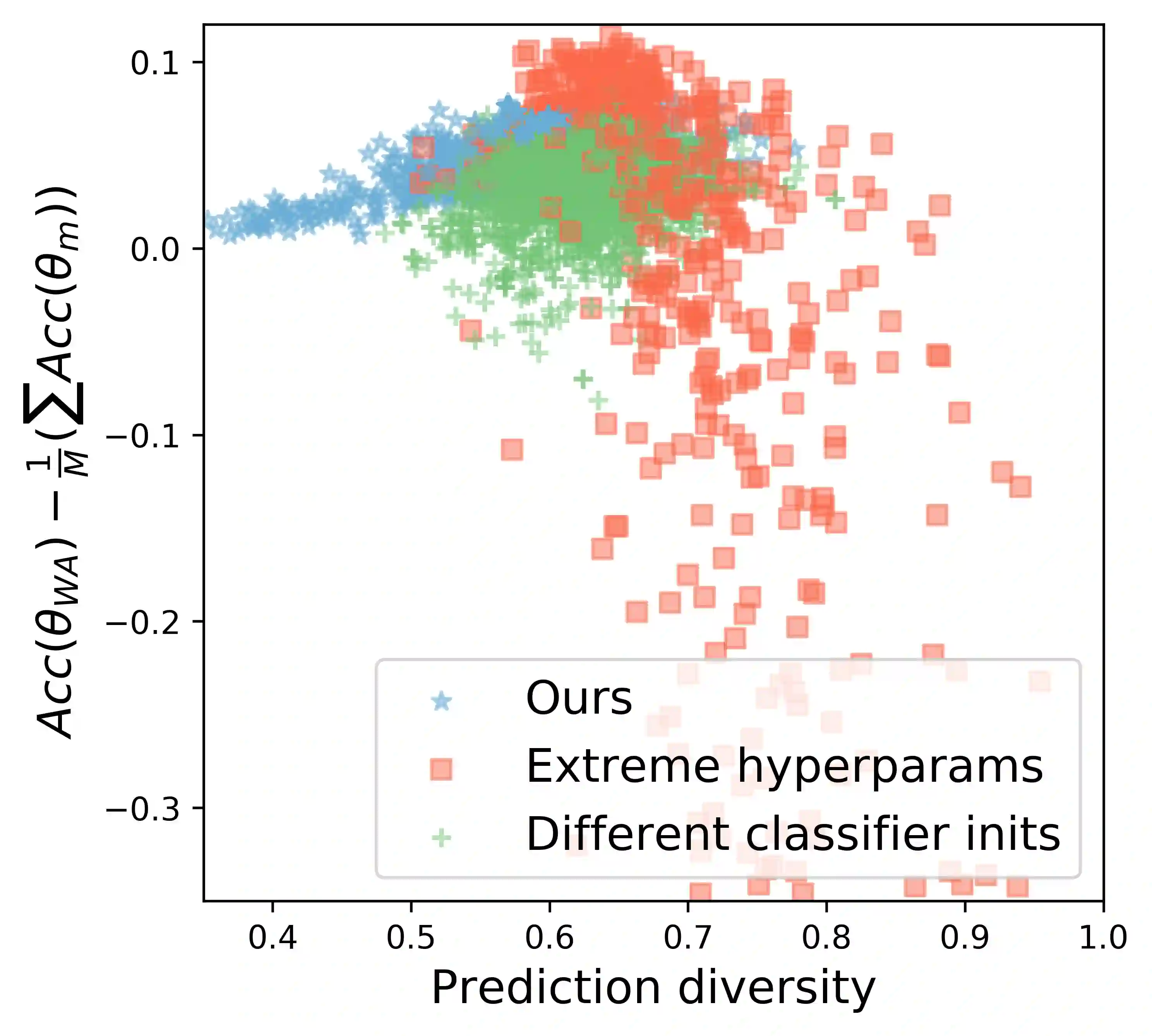 翻译:标准神经网络在分布变化中难以普及。 对于计算机视野的分布性一般化, 最佳的当前方法在培训运行过程中平均加权数。 在本文中, 我们提议“ 不同体重变化( DIWA) ”, 简单改变这一战略: DIWA 平均从数个独立培训运行中获得的加权数, 而不是一次运行。 也许令人惊讶的是, 平均这些加权数在软约束下表现良好, 尽管网络没有线性。 DIWA 背后的主要动机是增加平均模型的功能多样性。 事实上, 不同运行中获得的模型比单运行中收集的模型要多样化得多, 因为超参数和培训程序的差异。 我们通过新的偏差差异- 差异- 差异- 差异- 本地化来激励多样性的需要, 利用 DIWA 和标准功能组合之间的相似性。 此外, 这一分解突出显示, 当差异性术语在测试时会成功, 我们所显示的是当边际分布变化时, 。 实验性地, DWA 持续改善竞争性的DOB 基准的艺术状况。