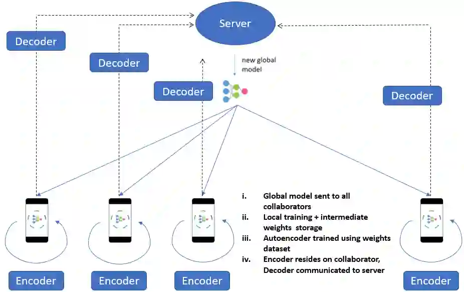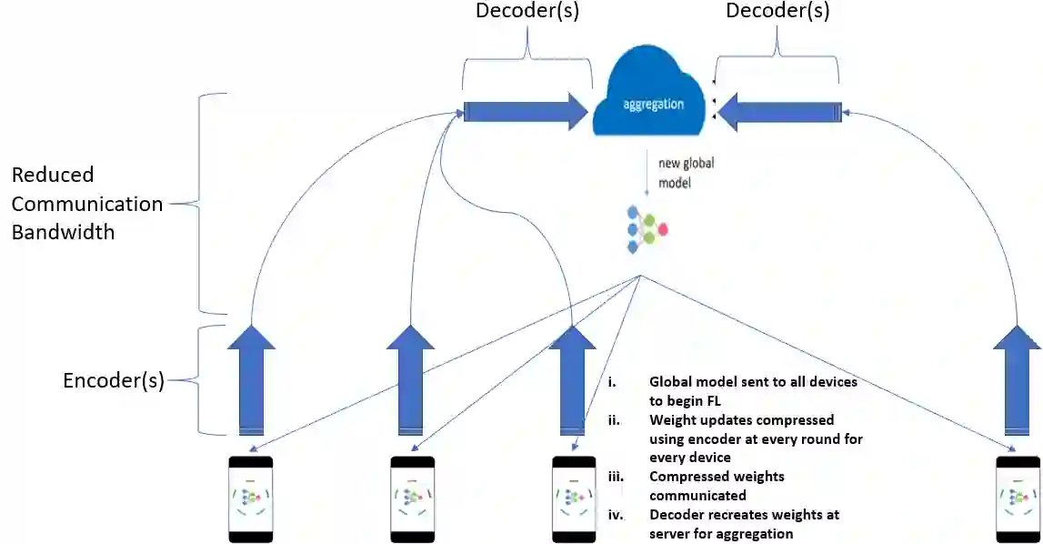 翻译:联邦学习联盟(FL) 解决了本十年中许多关于数据隐私和计算挑战的担忧。 FL 确保数据不会离开源头,因为模型是在数据所在地接受培训的。 但是, FL 带来自己的一系列挑战。 在这个分布环境中, 模型重量更新的交流会带来巨大的网络带宽成本。 在这方面, 我们提出一个机制, 使用Autoencoders(AE) 压缩重量更新( AE) 压缩, 了解重量更新的数据特征, 并随后进行压缩。 编码器设置在进行培训的每个节点上, 而解码器则设置在重量汇总的节点上。 这种设置通过编码器实现压缩, 并用解码器重新生成每轮通信回合结尾的重量。 本文显示, 动态和孔径AE 重量压缩技术可以作为大规模FL 的有利替代品( 或附加), 因为它不仅达到500x 至 1720x 及以后的压缩比率, 还可以根据给定的FL 的准确性要求、 计算能力和其他要求进行修改 。