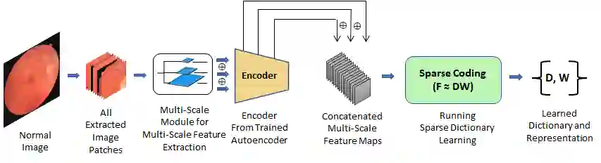 Convolutional Neural Network models have successfully detected retinal illness from optical coherence tomography (OCT) and fundus images. These CNN models frequently rely on vast amounts of labeled data for training, difficult to obtain, especially for rare diseases. Furthermore, a deep learning system trained on a data set with only one or a few diseases cannot detect other diseases, limiting the system's practical use in disease identification. We have introduced an unsupervised approach for detecting anomalies in retinal images to overcome this issue. We have proposed a simple, memory efficient, easy to train method which followed a multi-step training technique that incorporated autoencoder training and Multi-Scale Deep Feature Sparse Coding (MDFSC), an extended version of normal sparse coding, to accommodate diverse types of retinal datasets. We achieve relative AUC score improvement of 7.8\%, 6.7\% and 12.1\% over state-of-the-art SPADE on Eye-Q, IDRiD and OCTID datasets respectively.