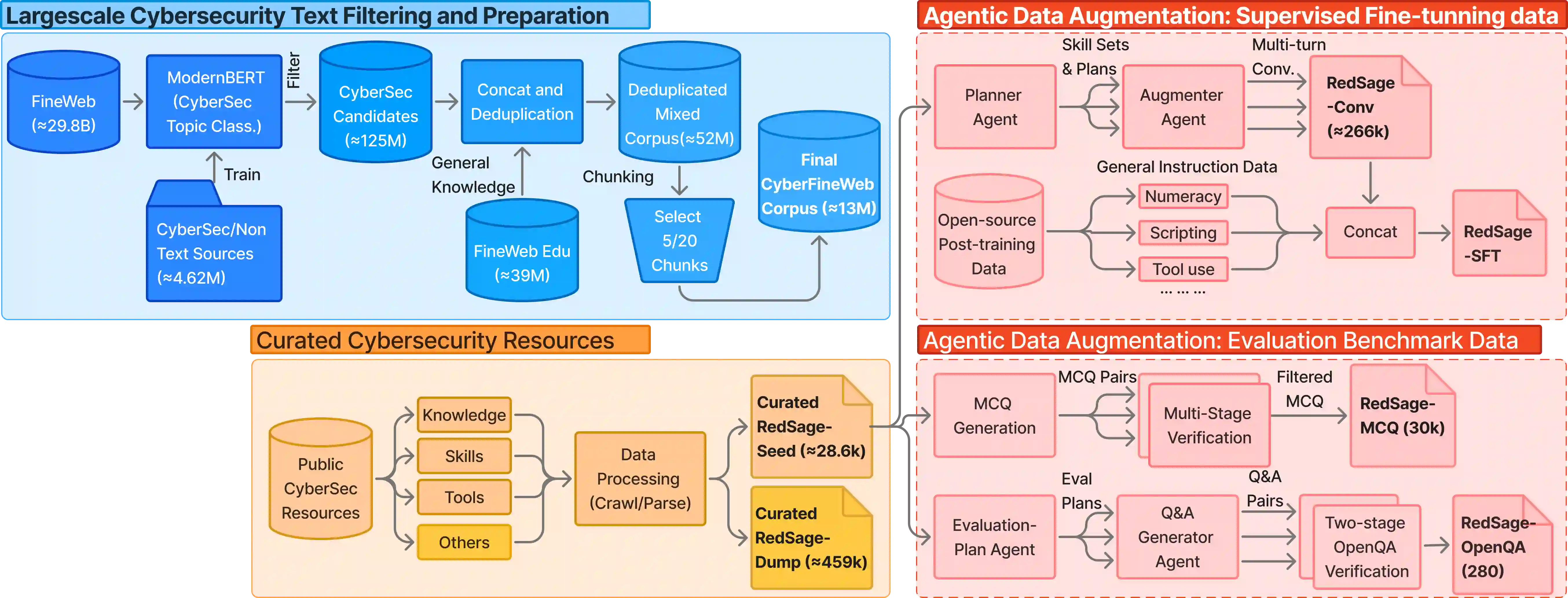 Cybersecurity operations demand assistant LLMs that support diverse workflows without exposing sensitive data. Existing solutions either rely on proprietary APIs with privacy risks or on open models lacking domain adaptation. To bridge this gap, we curate 11.8B tokens of cybersecurity-focused continual pretraining data via large-scale web filtering and manual collection of high-quality resources, spanning 28.6K documents across frameworks, offensive techniques, and security tools. Building on this, we design an agentic augmentation pipeline that simulates expert workflows to generate 266K multi-turn cybersecurity samples for supervised fine-tuning. Combined with general open-source LLM data, these resources enable the training of RedSage, an open-source, locally deployable cybersecurity assistant with domain-aware pretraining and post-training. To rigorously evaluate the models, we introduce RedSage-Bench, a benchmark with 30K multiple-choice and 240 open-ended Q&A items covering cybersecurity knowledge, skills, and tool expertise. RedSage is further evaluated on established cybersecurity benchmarks (e.g., CTI-Bench, CyberMetric, SECURE) and general LLM benchmarks to assess broader generalization. At the 8B scale, RedSage achieves consistently better results, surpassing the baseline models by up to +5.59 points on cybersecurity benchmarks and +5.05 points on Open LLM Leaderboard tasks. These findings demonstrate that domain-aware agentic augmentation and pre/post-training can not only enhance cybersecurity-specific expertise but also help to improve general reasoning and instruction-following. All models, datasets, and code are publicly available.