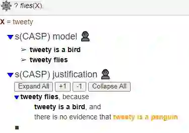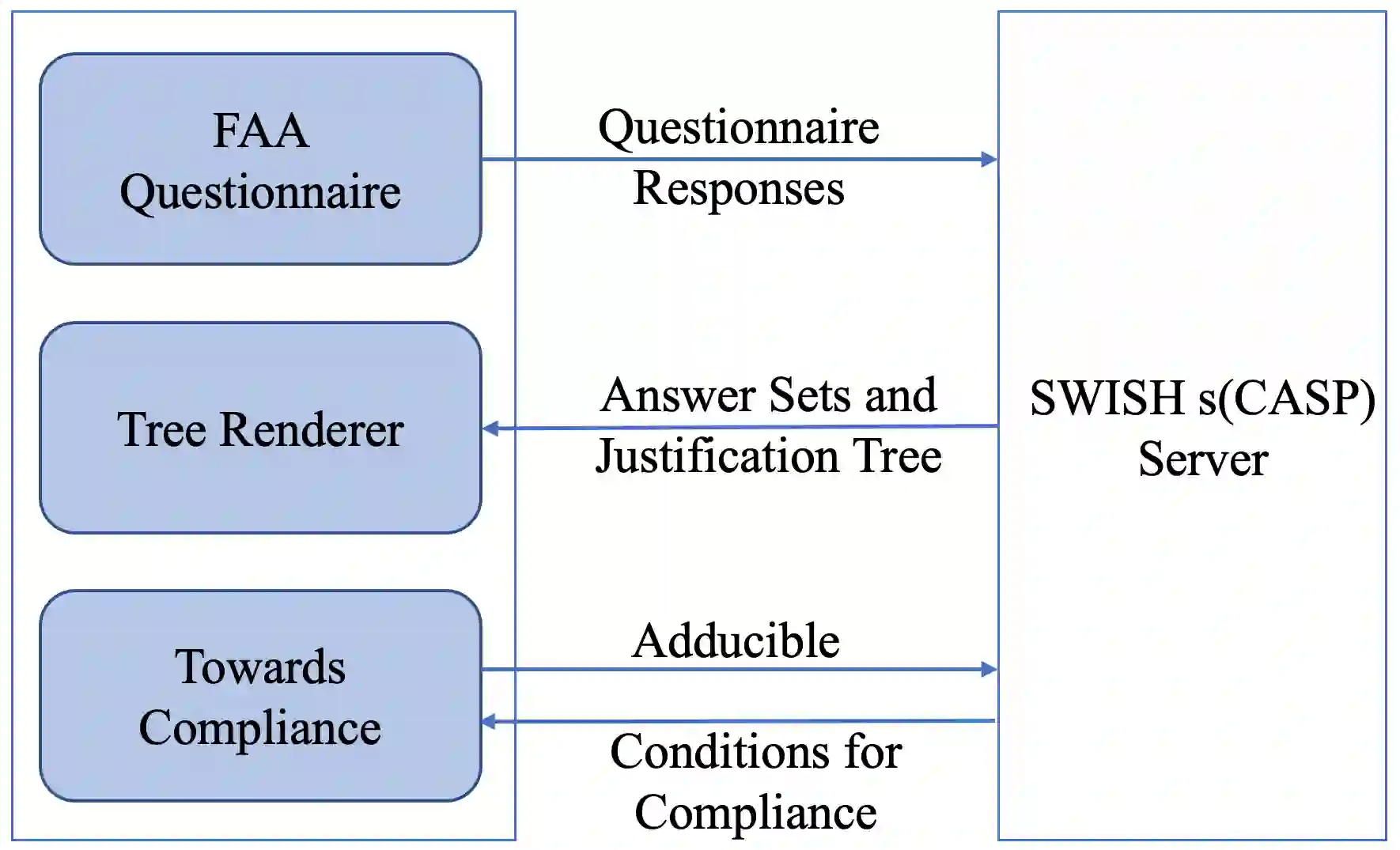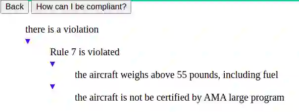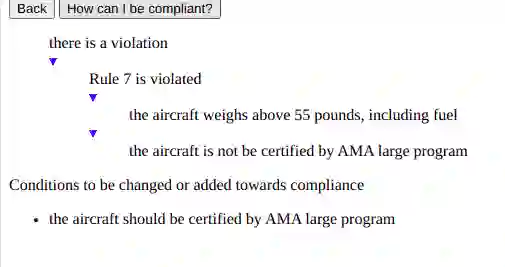 翻译:我们提出了一种新应用的“目标识别答案设置程序”,将示范飞机操作员的合规核查与模拟航空器学会安全守则进行数字化。AMA安全守则规范了AMA传单如何为有限的娱乐目的操作无人驾驶航空器(UAVs),飞行无人驾驶飞机及其操作员在飞机操作之前和之后遵守各种规则以确保安全飞行。在本文件中,我们利用“答案设定程序”来编码AMA安全守则和自动合规检查。为了检查遵守情况,我们使用以目标为导向的ASP引擎S(CASP)进行合规核查。通过S(CASP)操作者可以很容易地检查违规情况,并获得解释可人读自然语言中违规原因的理由树。此外,我们采用算法帮助操作员获得为通过合规检查而需要满足的最低限度条件。我们开发了一个前端问卷接口,接受各种条件,并使用后端SASP发动机来评估条件是否符合条例。我们还利用了ASPASPASPASP系统第一版的S-AVIS系统应用软件和SWI系统最佳应用能力,这是SWISA-ProRO-S-ProviS-SLA的S-Svial应用系统。我们S-S-S-S-S-S-S-S-SLisalvialvivivivivial的系统应用系统应用系统。