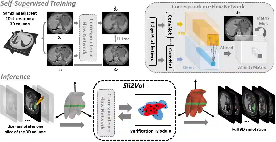 The objective of this work is to segment any arbitrary structures of interest (SOI) in 3D volumes by only annotating a single slice, (i.e. semi-automatic 3D segmentation). We show that high accuracy can be achieved by simply propagating the 2D slice segmentation with an affinity matrix between consecutive slices, which can be learnt in a self-supervised manner, namely slice reconstruction. Specifically, we compare the proposed framework, termed as Sli2Vol, with supervised approaches and two other unsupervised/ self-supervised slice registration approaches, on 8 public datasets (both CT and MRI scans), spanning 9 different SOIs. Without any parameter-tuning, the same model achieves superior performance with Dice scores (0-100 scale) of over 80 for most of the benchmarks, including the ones that are unseen during training. Our results show generalizability of the proposed approach across data from different machines and with different SOIs: a major use case of semi-automatic segmentation methods where fully supervised approaches would normally struggle. The source code will be made publicly available at https://github.com/pakheiyeung/Sli2Vol.