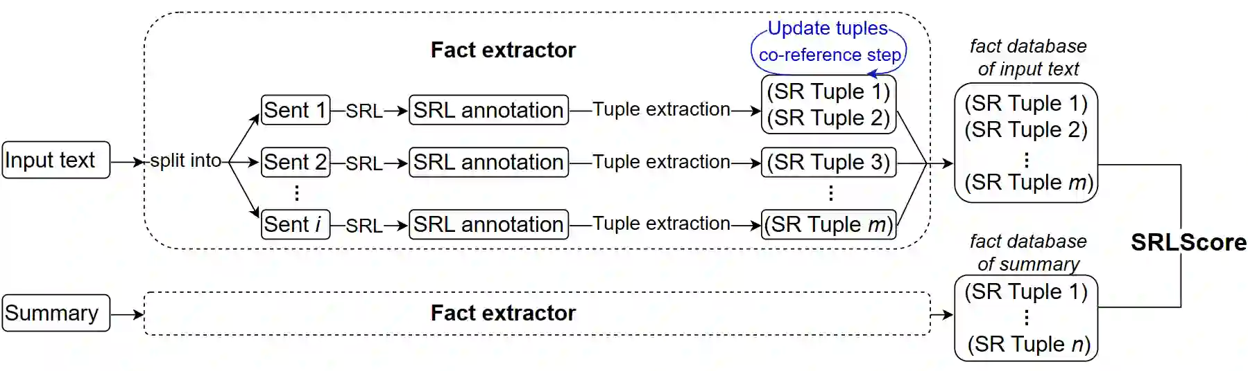 Automated evaluation of text generation systems has recently seen increasing attention, particularly checking whether generated text stays truthful to input sources. Existing methods frequently rely on an evaluation using task-specific language models, which in turn allows for little interpretability of generated scores. We introduce SRLScore, a reference-free evaluation metric designed with text summarization in mind. Our approach generates fact tuples constructed from Semantic Role Labels, applied to both input and summary texts. A final factuality score is computed by an adjustable scoring mechanism, which allows for easy adaption of the method across domains. Correlation with human judgments on English summarization datasets shows that SRLScore is competitive with state-of-the-art methods and exhibits stable generalization across datasets without requiring further training or hyperparameter tuning. We experiment with an optional co-reference resolution step, but find that the performance boost is mostly outweighed by the additional compute required. Our metric is available online at https://github.com/heyjing/SRLScore.