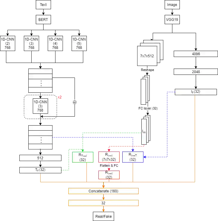 翻译:假新闻探测是提高媒体信息可信度的一项重要任务,因为假新闻每天都在社交媒体上不断传播,这是我们社会非常严重关切的一个问题。假新闻通常是通过操纵图像、文本和视频制造的。在本文中,我们展示了一种新颖的方法,通过使用来自文字和视觉数据的多式功能来检测假新闻。具体地说,我们使用预先培训的BERT模型学习文字功能,并在图像网络数据集上预先培训VGG-19模型来提取图像特征。我们提出了一个比例-点产品关注机制,以捕捉文本特征和视觉特征之间的关系。实验结果显示,我们的方法比公共推特数据集中目前的最新方法要好,精确度为3.1%。