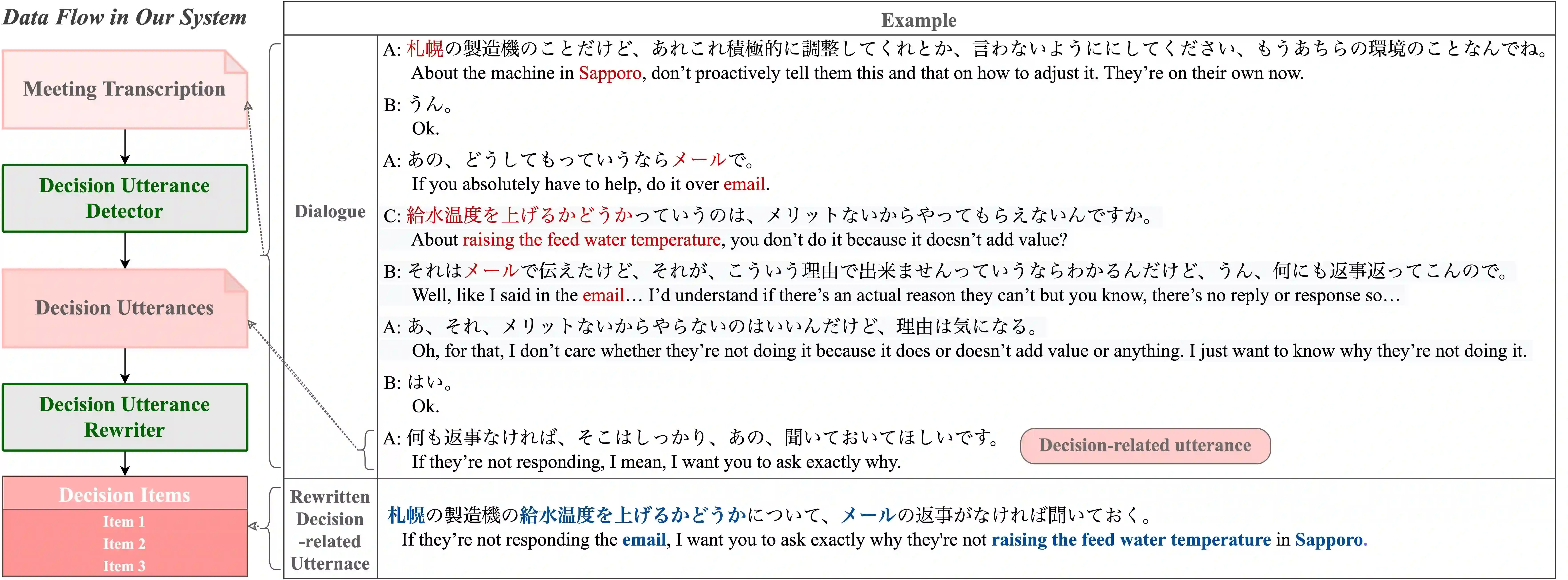 翻译:会议是商业和项目合作决策的普遍过程,在日常会议上自动逐项决定的能力使得能够对过去的讨论进行广泛跟踪。为此,我们开发了会议决定跟踪器,这是一个构建决定项目的原型系统,由决定倾述检测器和决定倾述重写组成。我们显示,DUR通过处理自然对话的倾述崩溃,为改进用户经验作出了巨大贡献。我们系统的介绍视频也可在https://youtu.be/TG1pJJo0Iqo上查阅。