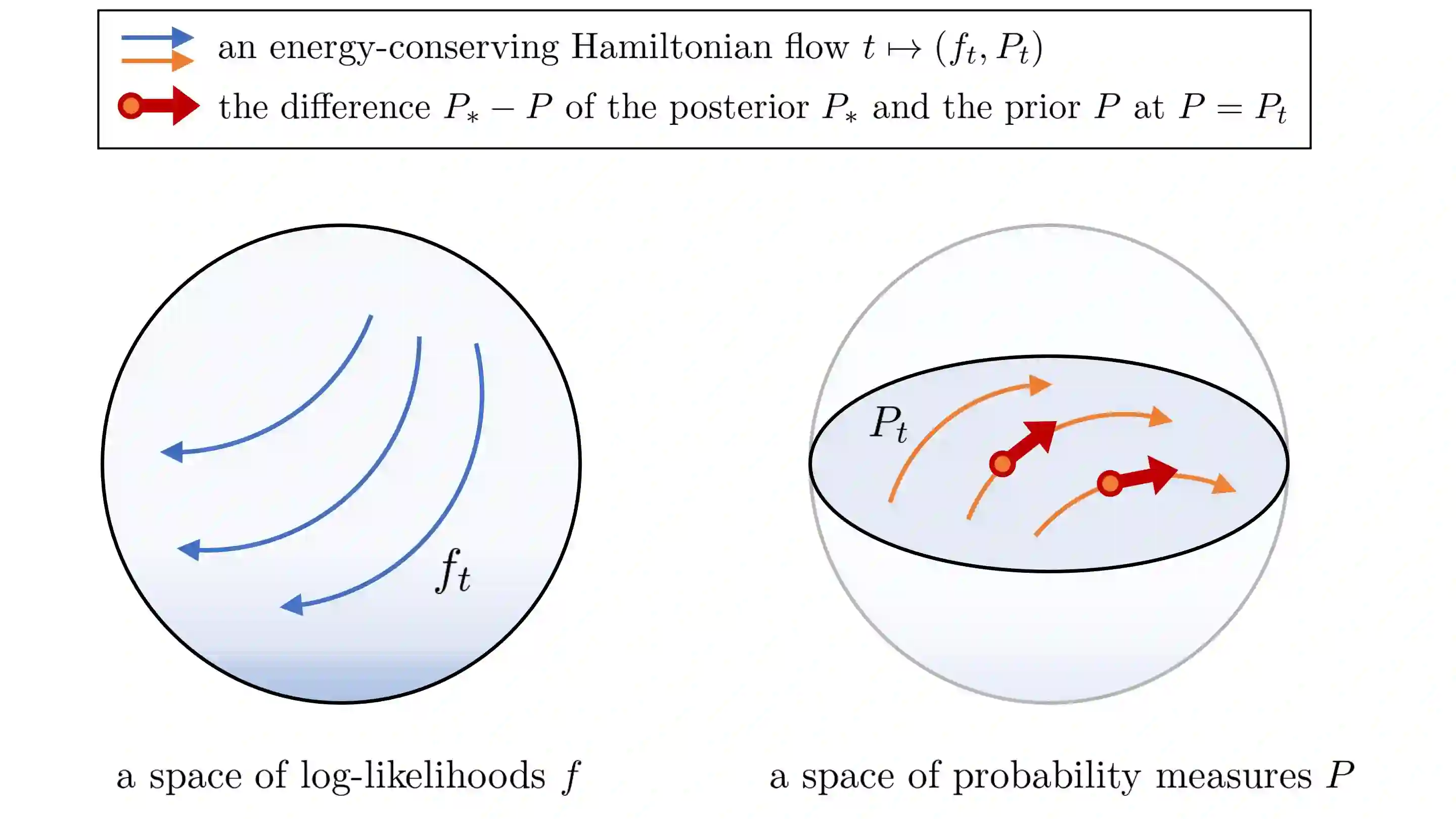 This paper makes two theoretical contributions. First, we establish a novel class of Hamiltonian systems, called arc Hamiltonian systems, for saddle Hamiltonian functions over infinite-dimensional metric spaces. Arc Hamiltonian systems generate a flow that satisfies the law of conservation of energy everywhere in a metric space. They are governed by an extension of Hamilton's equation formulated based on (i) the framework of arc fields and (ii) an infinite-dimensional gradient, termed the arc gradient, of a Hamiltonian function. We derive conditions for the existence of a flow generated by an arc Hamiltonian system, showing that they reduce to local Lipschitz continuity of the arc gradient under sufficient regularity. Second, we present two Hamiltonian functions, called the cumulant generating functional and the centred cumulant generating functional, over a metric space of log-likelihoods and measures. The former characterises the posterior of Bayesian inference as a part of the arc gradient that induces a flow of log-likelihoods and non-negative measures. The latter characterises the difference of the posterior and the prior as a part of the arc gradient that induces a flow of log-likelihoods and probability measures. Our results reveal an implication of the belief updating mechanism from the prior to the posterior as an infinitesimal change of a measure in the infinite-dimensional Hamiltonian flows.