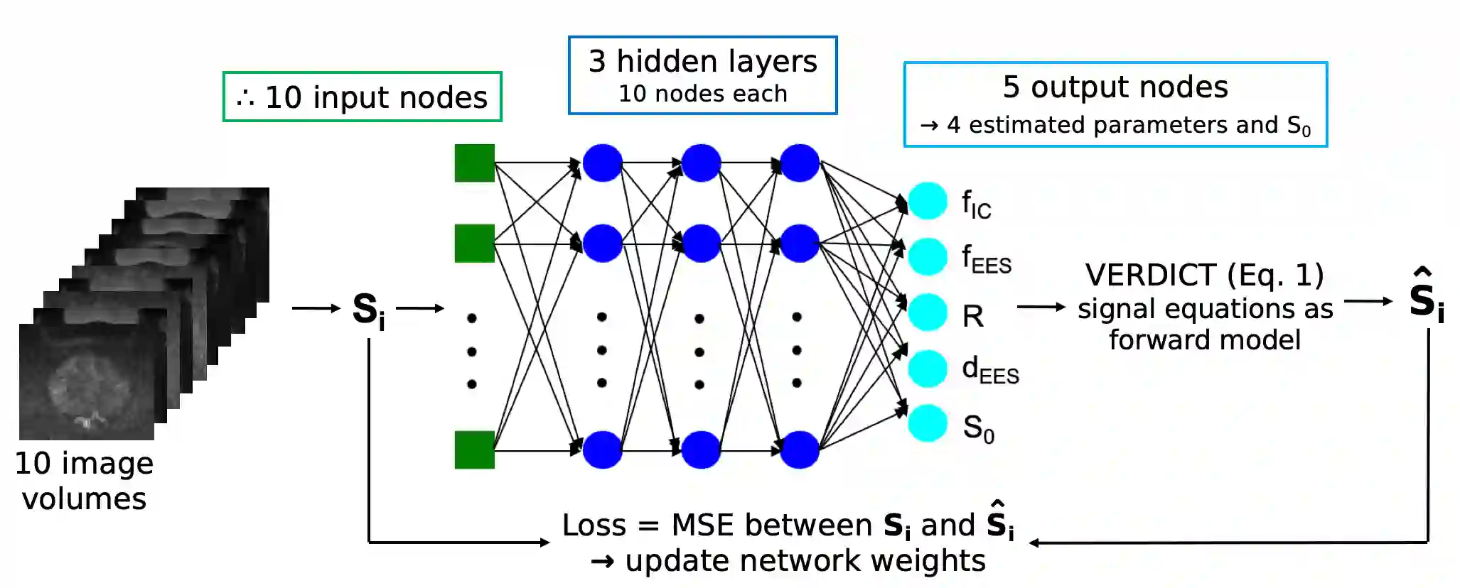 Purpose: Demonstrating and assessing self-supervised machine learning fitting of the VERDICT (Vascular, Extracellular and Restricted DIffusion for Cytometry in Tumours) model for prostate. Methods: We derive a self-supervised neural network for fitting VERDICT (ssVERDICT) that estimates parameter maps without training data. We compare the performance of ssVERDICT to two established baseline methods for fitting diffusion MRI models: conventional nonlinear least squares (NLLS) and supervised deep learning. We do this quantitatively on simulated data, by comparing the Pearson's correlation coefficient, mean-squared error (MSE), bias, and variance with respect to the simulated ground truth. We also calculate in vivo parameter maps on a cohort of 20 prostate cancer patients and compare the methods' performance in discriminating benign from cancerous tissue via Wilcoxon's signed-rank test. Results: In simulations, ssVERDICT outperforms the baseline methods (NLLS and supervised DL) in estimating all the parameters from the VERDICT prostate model in terms of Pearson's correlation coefficient, bias, and MSE. In vivo, ssVERDICT shows stronger lesion conspicuity across all parameter maps, and improves discrimination between benign and cancerous tissue over the baseline methods. Conclusion: ssVERDICT significantly outperforms state-of-the-art methods for VERDICT model fitting, and shows for the first time, fitting of a complex three-compartment biophysical model with machine learning without the requirement of explicit training labels.