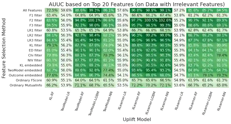 Uplift modeling is a causal learning technique that estimates subgroup-level treatment effects. It is commonly used in industry and elsewhere for tasks such as targeting ads. In a typical setting, uplift models can take thousands of features as inputs, which is costly and results in problems such as overfitting and poor model interpretability. Consequently, there is a need to select a subset of the most important features for modeling. However, traditional methods for doing feature selection are not fit for the task because they are designed for standard machine learning models whose target is importantly different from uplift models. To address this, we introduce a set of feature selection methods explicitly designed for uplift modeling, drawing inspiration from statistics and information theory. We conduct empirical evaluations on the proposed methods on publicly available datasets, demonstrating the advantages of the proposed methods compared to traditional feature selection. We make the proposed methods publicly available as a part of the CausalML open-source package.
